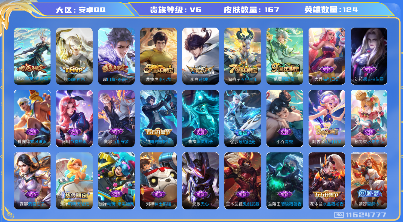 [11624777]V6 5传说 124英雄 167皮肤 可修改实名 优质装备:炽阳神光,山海·苍雷引(电光曜子) 传说皮:乘龙·铭钟鼎(赵云年限) 珍宝阁皮:蔷薇恋人,玩趣恶龙 限定皮:鸣野蒿,诗剑行,五谷丰年,李小龙 史诗皮:鸭鸭历险记-刘禅,龙之律动,琥珀纪元伽罗,超元猎域,百相守梦-黄忠,紫霞仙子,特工魅影,江河有灵,百解令(蒙犽),青蛇,晚萤,电玩·爆裂旋风,猫狗日记-大乔,节奏热浪,修罗,水果甜心,绅士熊喵,星夜王子,功夫厨神,德古拉伯爵,暗隐猎兽者,幽灵船长,鬼剑武藏,舞动绿茵,乘风破浪,逐浪之夏,水晶猎龙者,曙光守护者,金属风暴,鹰眼统帅,暗夜贵公子,魅力维加斯,赏金猎手,无心,未来纪元-赵云