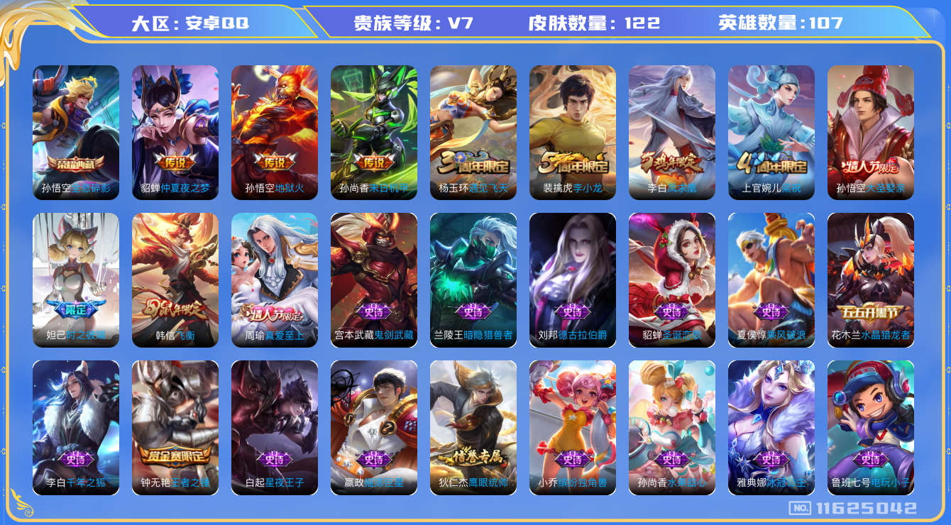 - [11253421]V7 1典藏 11传说 120英雄 263皮肤 可修改实名 优质装备:九霄神辉(木兰典藏),云鹰飞将(小将军),炽阳神光,地狱火,仲夏夜之梦(大飞蛾),无双飞将,山海·炽霜斩(李信年限),山海·琳琅生(小乔年限),山海·苍雷引(电光曜子) 珍宝阁皮:胡桃夹子 限定皮:至尊宝,飞衡(韩信年限),山海·碧波行(瑶年限),遇见飞天,齐天大圣,怒海麟威,五谷丰年,梁祝,李小龙,默契交锋-花木兰,启示之音,山海·玄木吟(马可年限) 史诗皮:鸭鸭历险记-刘禅,龙之律动,石田雨龙,决胜骁骑,蔬乡物语(鲁班七号),紫霞仙子,特工魅影,千年之狐,电玩·爆裂旋风,真我赫兹(镜),百解令(蒙犽),蒙恬荣光圣徽,偶像歌手,冰冠公主,猫狗日记-孙策,节奏热浪,女仆咖啡,摇滚巨星,水果甜心,星夜王子,功夫厨神,德古拉伯爵,幽灵船长,鬼剑武藏,乐园奇幻夜,地狱岩魂,繁星吟游(呼啦呼啦),乘风破浪,逐浪之夏,金属风暴,原初追逐者,圣诞狂欢,圣诞恋歌,鹰眼统帅,魅力维加斯,黎明之约,无心,未来纪元-赵云