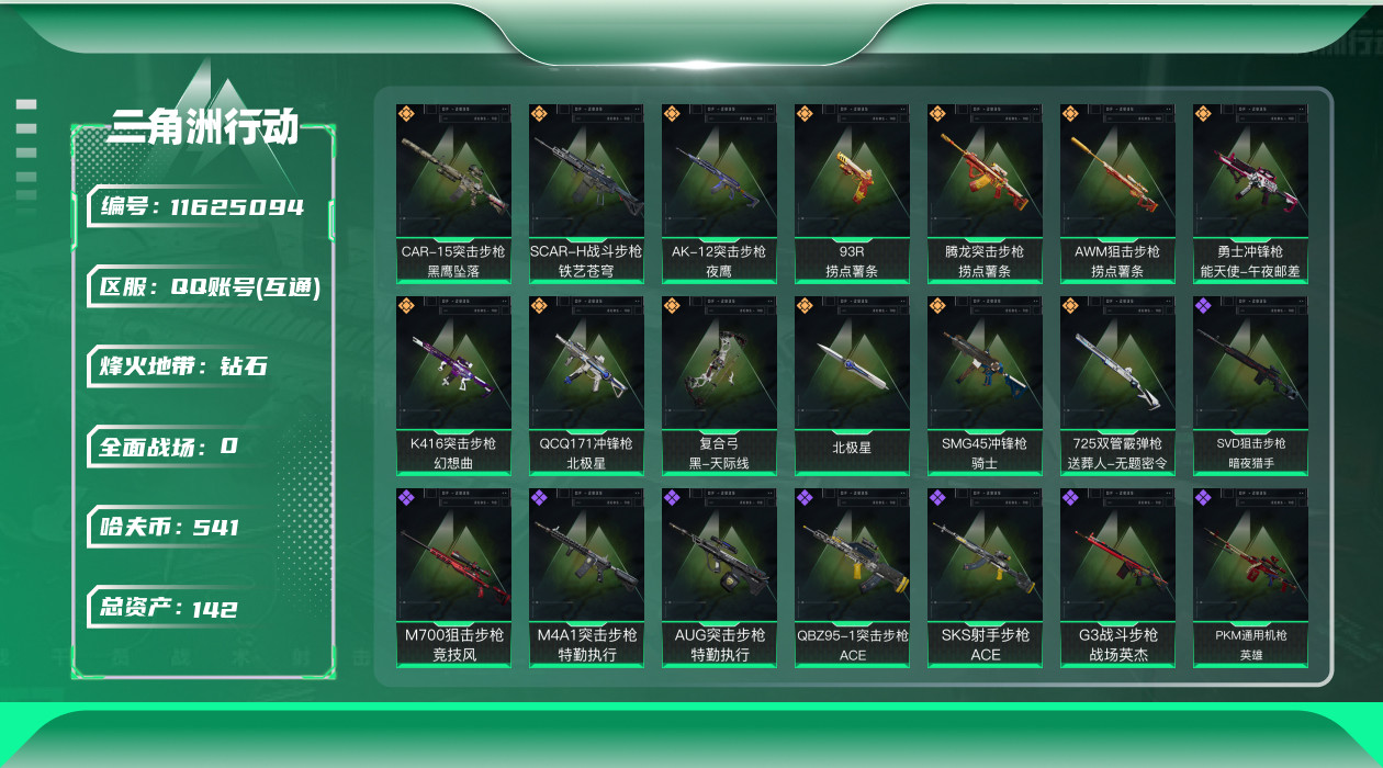 [11625094]总资产:142M 1近战传说 13传说枪械 哈夫币:541.227K 高级安全箱(9.17到期) 可二次 可修改实名 优质装备:近战-北极星 烽火地带段位:钻石 全面战场段位:尉官 传说武器皮肤:SCAR-H战斗步枪-铁艺苍穹,AK-12突击步枪-夜鹰,SMG45冲锋枪-骑士,93R-捞点薯条,AWM狙击步枪-捞点薯条,腾龙突击步枪-捞点薯条,勇士冲锋枪-能天使-午夜邮差,复合弓-黑-天际线,K416突击步枪-幻想曲,725双管霰弹枪-送葬人-无题密令,QCQ171冲锋枪-北极星,CAR-15突击步枪-黑鹰坠落 史诗武器皮肤:QBZ95-1突击步枪-ACE,M4A1突击步枪-特勤执行,AUG突击步枪-特勤执行,Vector冲锋枪-红色彗星,PTR-32战斗步枪-ACE,SKS射手步枪-ACE,AUG突击步枪-蝮蛇,G3战斗步枪-战场英杰,SVD狙击步枪-暗夜猎手,AS Val突击步枪-尖端治疗,M700狙击步枪-守夜人,SG552突击步枪-尖端治疗,PKM通用机枪-荒野求生,MP5冲锋枪-深海恐惧,勇士冲锋枪-深海恐惧,AKM突击步枪-林中猎手,.357左轮-幸运时刻,SR-3M紧凑突击步枪-荒野求生,M1014霰弹枪-林中猎手,SVD狙击步枪-荒野求生,AS Val突击步枪-典狱官,M250通用机枪-囚徒,腾龙突击步枪-无垢,MP7冲锋枪-无垢,PSG-1射手步枪-无垢,M14射手步枪-黑鹰坠落,SVD狙击步枪-阿萨拉工艺,S12K霰弹枪-曙光,PKM通用机枪-英雄,M700狙击步枪-竞技风