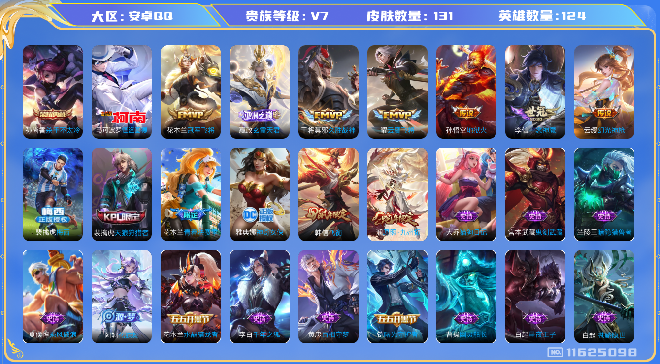 [11625098]V7 1典藏 1珍品传说 8传说 124英雄 131皮肤 可修改实名 优质装备:杀手不太冷,怪盗基德,冠军飞将,云鹰飞将(小将军),久胜战神,一念神魔,地狱火,玄雷天君 传说皮:幻光神枪 限定皮:愿照·九州拓(澜年限),梅西,飞衡(韩信年限),天狼狩猎者,青春决赛季,神奇女侠 史诗皮:苍鳞隐世,化蝶舞,龙之律动,茶境仙,百相守梦-黄忠,白龙吟,特工魅影,千年之狐,猫狗日记-大乔,水果甜心,星夜王子,功夫厨神,暗隐猎兽者,幽灵船长,鬼剑武藏,乐园奇幻夜,舞动绿茵,乘风破浪,逐浪之夏,水晶猎龙者,曙光守护者,鹰眼统帅,魅力维加斯,未来纪元-赵云