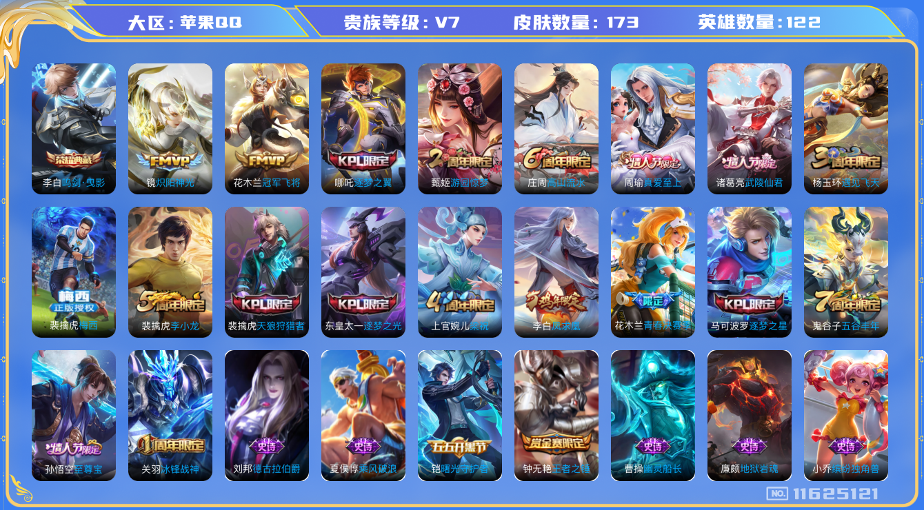 [11625121]V7 1典藏 4传说 122英雄 173皮肤 可修改实名 优质装备:鸣剑·曳影,冠军飞将,炽阳神光 珍宝阁皮:优雅恋人 限定皮:至尊宝,凤求凰(白切鸡),梅西,武陵仙君(小桃花),遇见飞天,高山流水,五谷丰年,冰锋战神,游园惊梦,梁祝,天狼狩猎者,逐梦之翼,逐梦之星,李小龙,逐梦之光,真爱至上,青春决赛季 史诗皮:紫霞仙子,电玩小子(小书包),白龙吟,千年之狐,冰冠公主,偶像歌手,猫狗日记-孙策,水果甜心,德古拉伯爵,暗隐猎兽者,幽灵船长,地狱岩魂,拒霜思,缤纷独角兽,乘风破浪,逐浪之夏,水晶猎龙者,曙光守护者,圣诞狂欢,圣诞恋歌,鹰眼统帅,王者之锤,暗夜贵公子,魅力维加斯,无心,未来纪元-赵云