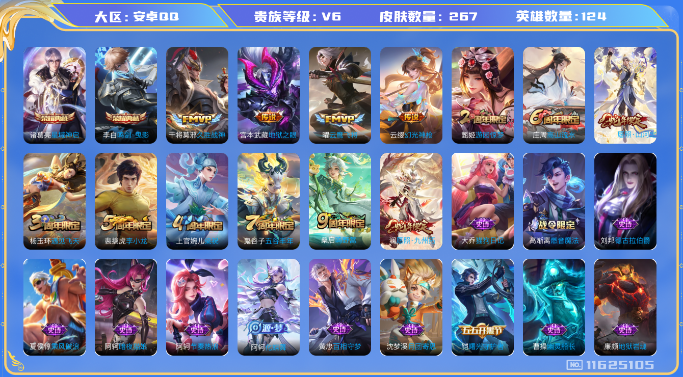 [11625105]V6 2典藏 7传说 124英雄 267皮肤 可修改实名 优质装备:鸣剑·曳影,星域神启(倪克斯贼亮),云鹰飞将(小将军),久胜战神,地狱之眼 传说皮:幻光神枪 珍宝阁皮:蔷薇恋人,女武神 限定皮:愿照·九州拓(澜年限),愿照·山河定(司空震年限),鸣野蒿,遇见飞天,高山流水,五谷丰年,游园惊梦,梁祝,李小龙 史诗皮:器灵·浮梦炉,化蝶舞,灵蛊蚀心,星界战将,龙之律动,石田雨龙,茶境仙,破空之剑,蒙犽顽岩魄,琥珀纪元伽罗,百相守梦-黄忠,白龙吟,黄金分割率,特工魅影,千年之狐,江河有灵,百解令(蒙犽),高渐离燃音魔法,蒙恬荣光圣徽,青蛇,偶像歌手,晚萤,电玩·爆裂旋风,暗夜猫娘,末日机甲-吕布,猫狗日记-孙策,猫狗日记-大乔,乱世虎臣,节奏热浪,修罗,女仆咖啡,水果甜心,绅士熊喵,天才门将,星夜王子,心灵骇客,功夫厨神,德古拉伯爵,暗隐猎兽者,幽灵船长,鬼剑武藏,心灵战警,舞动绿茵,地狱岩魂,繁星吟游(呼啦呼啦),缤纷独角兽,乘风破浪,逐浪之夏,月团寄思,水晶猎龙者,曙光守护者,箭羽风息,金属风暴,原初追逐者,圣诞狂欢,圣诞恋歌,鹰眼统帅,暗夜贵公子,魅力维加斯,黎明之约,无心,未来纪元-赵云