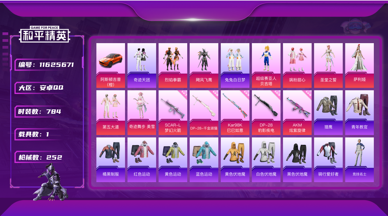 [11625671]7粉装 5特效枪 1载具 15印记 可二次 可修改实名 身法装备:暗影哥特(红眼罩) 优质装备:阿斯顿·马丁DBX(橙),AKM炫紫旋律,SCAR-L梦幻火箭,七级SCAR-L-梦幻火箭,DP-28-千金淑猫,萨利娅,奇迹舞步-美雪,Kar98K-巳巳如意 热门装扮:飓风飞鹰,烈焰拳霸,第五大道,超级赛亚人贝吉塔,飒粉甜心,圣堂之誓,兔兔白日梦,奇迹天团 稀有枪皮:DP-28-豹影疾电 六级特效枪:六级DP-28-千金淑猫 五级特效枪:五级Kar98K-巳巳如意,五级DP-28-豹影疾电 四级特效枪:四级AKM-炫紫旋律 紫色装扮:田园牧歌,轻风白浪,和煦暖阳,SS22特训,SS23特训,幻彩翩翩,妙红点点,香榭午后,白兰地假日,娇憨猪猪,萌趣咩咩,SS21特训,SS31特训套装,虚空漩涡,SS5特训,人气偶像,冷焰舞者,北国孤狼,霓虹热舞,旭日情侣,SS30特训套装,云朵鹅,彩虹兔,雪绒豹,SS33特训套装,顶瓜瓜,SS20特训,SS15特训,暗夜傀儡,艾克斯奥特曼,时空追击者,暴风机械师,SS16特训,遗落祭司,SS13特训,诡谋托雷基亚,星梦畅游,SS14特训,怪笑疯兔,萌趣颜团子,特种颜团子,海龙战士,SS19特训,竞技角斗士,瑞龙福将,团圆交子,醒狮腾龙,SS17特训,极乐追光,异彩先驱,缤纷焰火,SS18特训,智慧隐士,都市魅力,酒红色名流,酷潮明星,野性山猫,野性战心,长空猛禽,雪山精英,霓虹极客,霓虹街区,青年教官,荣耀,荧惑魅影,蓝彩潮人,蓝色运动,虎虎生威吉莉,街头潮人,超能勇士,跃动心情,绛羽幽主,暖暖向日葵,飞行日记,龙腾端午,骑行爱好者,魅力单车,鹤鸣,麻辣教官,黄色伏地魔,黄色名流,黄色运动,黎明保卫者,黑色伏地魔,龙的传人,龟仙人,冰河战士,龙魂突击队,蝶变,极速红龙,柠萌假日,格斗先锋,橘黑制服,沙漠兵团,活力之心,海岛探路者,涂山之恋,深蓝色名流,滨海假日,幻影武者,圣诞大吉,坚韧舞者,夏日音浪,完美偶像,帅气教官,幻世战舞者,战地督导,湖蓝色名流,滨海厨神,绮丽涂鸦,疯狂小兔子,白熊同盟,白色伏地魔,破晓战魂,破蛋小黄鸡,福星高照,空岛之星,空投萌叽,竞技勇士朋克,竞技达人朋克,红色运动,甜蜜熊情侣,王牌教练,牛气冲天,灼焰舞者,炫蓝之夏,热血青春,牛气满满,猛禽,狂战萌兔,猎鹰,短笛,雏菊兔兔,萝兰蝴蝶,SS29特训,拉斐尔