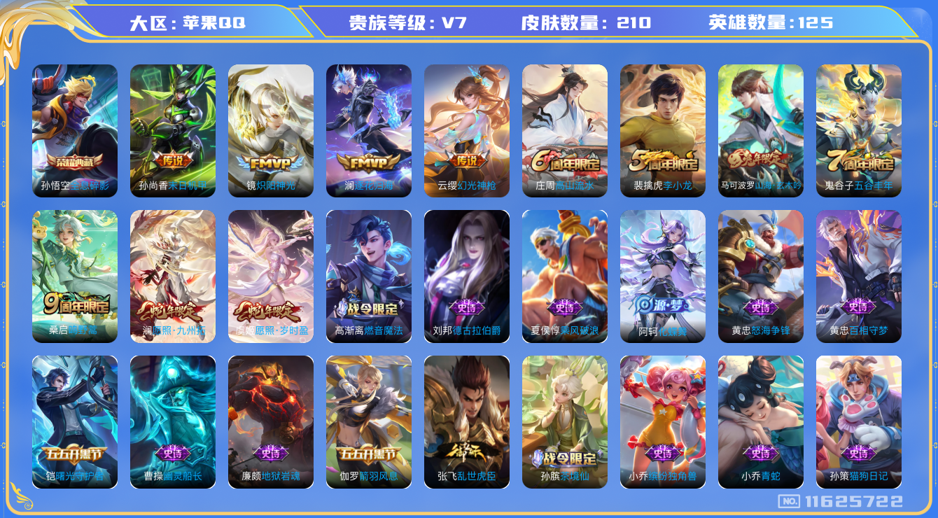 [11625722]V7 1典藏 7传说 125英雄 210皮肤 可修改实名 优质装备:全息碎影(猴子典藏),炽阳神光,末日机甲-孙尚香(绿蚂蚱),澜逐花归海 传说皮:幻光神枪 珍宝阁皮:妄想食味,胡桃夹子,女武神 限定皮:愿照·九州拓(澜年限),愿照·岁时盈(虞姬年限),鸣野蒿,高山流水,五谷丰年,李小龙,山海·玄木吟(马可年限) 史诗皮:鸭鸭历险记-刘禅,器灵·浮梦炉,绮世丹青,化蝶舞,星界战将,龙之律动,百相守梦-周瑜,茶境仙,怒海争锋,蔬乡物语(鲁班七号),百相守梦-黄忠,特工魅影,千年之狐,永昼,江河有灵,魅语,高渐离燃音魔法,蒙恬荣光圣徽,青蛇,猫狗日记-孙策,乱世虎臣,水果甜心,天才门将,星夜王子,功夫厨神,德古拉伯爵,暗隐猎兽者,幽灵船长,天秀·启明,地狱岩魂,诗语江南,纤云弄巧,缤纷独角兽,乘风破浪,逐浪之夏,水晶猎龙者,曙光守护者,箭羽风息,金属风暴,鹰眼统帅,魅力维加斯,无心