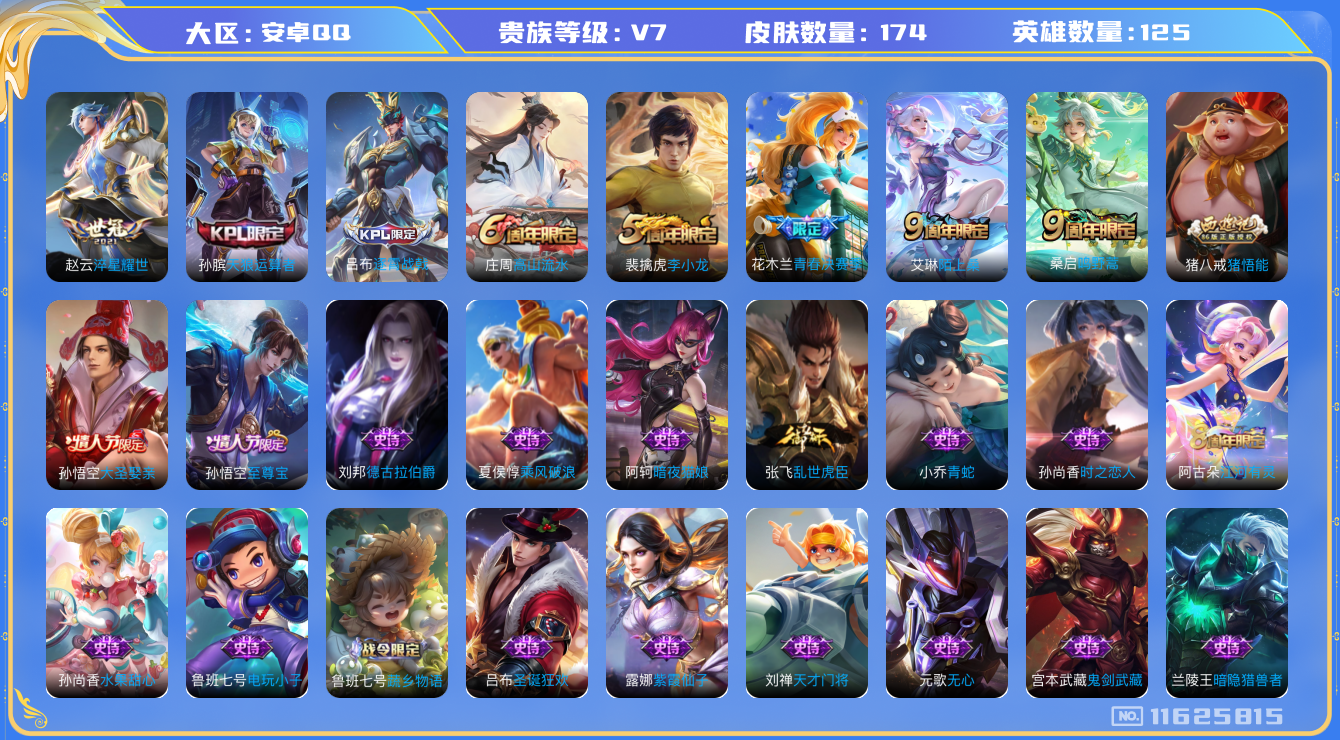 [11625815]V7 2传说 125英雄 174皮肤 可修改实名 传说皮:淬星耀世 珍宝阁皮:玩趣恶龙 限定皮:逐霄战戟,陌上桑,鸣野蒿,至尊宝,高山流水,天狼运算者,李小龙,猪悟能,大圣娶亲,青春决赛季 史诗皮:龙之律动,蔬乡物语(鲁班七号),破空之剑,紫霞仙子,电玩小子(小书包),白龙吟,特工魅影,江河有灵,冰冠公主,青蛇,暗夜猫娘,时之恋人-孙尚香,乱世虎臣,女仆咖啡,水果甜心,天才门将,心灵骇客,德古拉伯爵,暗隐猎兽者,鬼剑武藏,心灵战警,纤云弄巧,拒霜思,乘风破浪,逐浪之夏,水晶猎龙者,热力回旋,金属风暴,圣诞狂欢,圣诞恋歌,鹰眼统帅,魅力维加斯,无心,未来纪元-赵云
