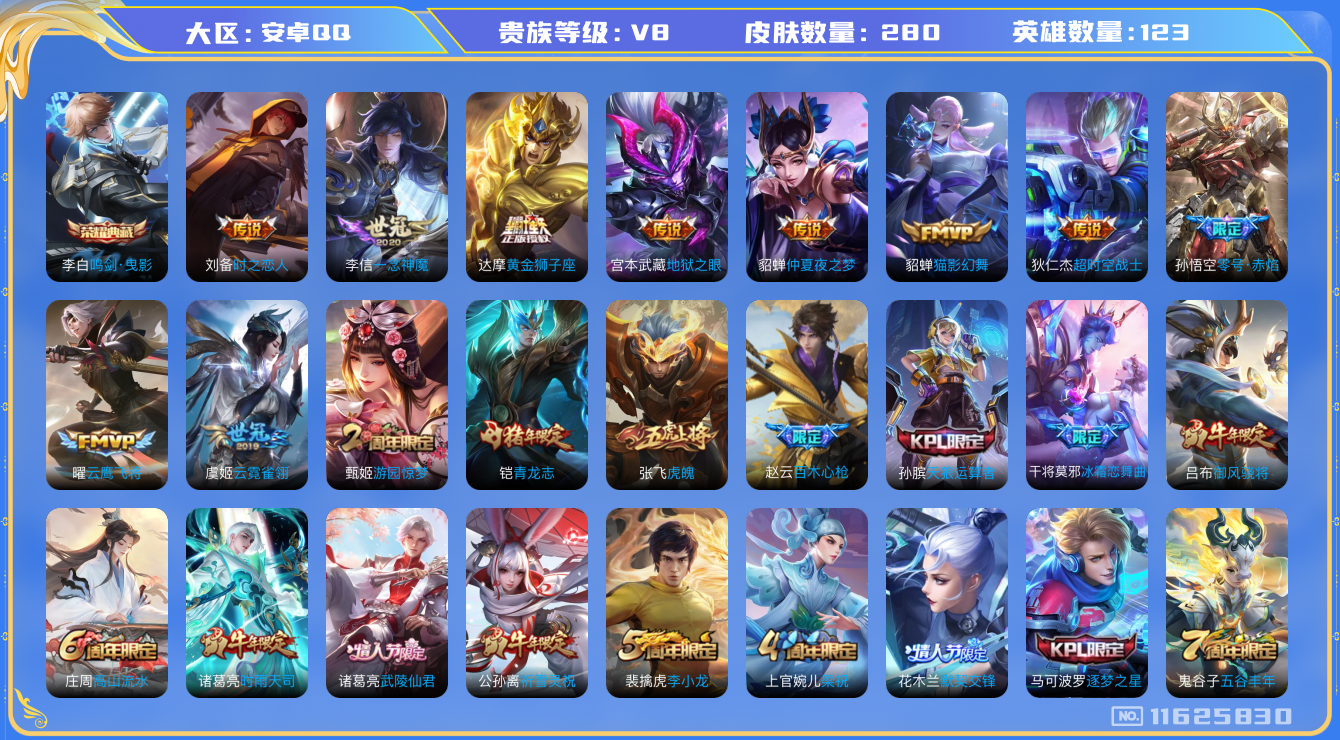 [11625830]V8 1典藏 17传说 123英雄 280皮肤 可修改实名 连体和平 优质装备:鸣剑·曳影,黄金狮子座,云鹰飞将(小将军),猫影幻舞,一念神魔,云霓雀翎,仲夏夜之梦(大飞蛾),零号·赤焰,地狱之眼,时之恋人-刘备(电焊工),超时空战士-狄仁杰 珍宝阁皮:优雅恋人,玩趣恶龙 限定皮:鸣野蒿,至尊宝,白虎志(电光耗子),武陵仙君(小桃花),傲雪梅枪,补天,白晶晶,时雨天司(水龙头),神威(电光马子),飞衡(韩信年限),高山流水,五谷丰年,青龙志(铠年限),冰锋战神,天狼运算者,游园惊梦,梁祝,御风骁将(吕布年限),逐梦之星,虎魄,祈雪灵祝(雪兔子),李小龙,逐梦之影,默契交锋-花木兰,孙行者,大圣娶亲,冰霜恋舞曲,神奇女侠,百木心枪 史诗皮:紫霞仙子,苍穹之光,电玩小子(小书包),白龙吟,黄金分割率,特工魅影,千年之狐,永昼,电玩·爆裂旋风,江河有灵,高渐离燃音魔法,蒙恬荣光圣徽,偶像歌手,暗夜猫娘,魅语,晚萤,末日机甲-吕布,猫狗日记-孙策,时之恋人-孙尚香,乱世虎臣,节奏热浪,修罗,女仆咖啡,摇滚巨星,水果甜心,天才门将,星夜王子,心灵骇客,功夫厨神,暗隐猎兽者,幽灵船长,鬼剑武藏,暗渊魔法,心灵战警,舞动绿茵,地狱岩魂,纤云弄巧,繁星吟游(呼啦呼啦),拒霜思,缤纷独角兽,乘风破浪,逐浪之夏,水晶猎龙者,曙光守护者,金属风暴,原初追逐者,圣诞狂欢,圣诞恋歌,鹰眼统帅,暗夜贵公子,魅力维加斯,黎明之约,无心