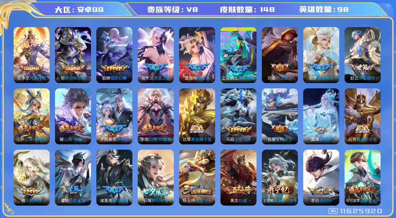 [11625920]V8 2典藏 25传说 98英雄 148皮肤 可修改实名 荣耀水晶:九霄神辉(木兰典藏),银白咏叹调(倪克斯侍卫) 传说皮:山海·炽霜斩(李信年限),山海·琳琅生(小乔年限),黄金狮子座,黄金射手座,云霓雀翎,淬星耀世,猫影幻舞,炽阳神光,无双飞将,时之恋人-刘备(电焊工),碎云,山海·苍雷引(电光曜子),炽翼辉光(娃娃菜牛角包),燃星之曲,画中仙,浮生妄,鹤羽星尊,妄想奇谈,鹤归松栖(云缨),霜月吟 限定皮:凤凰于飞,飞衡(韩信年限),山海·碧波行(瑶年限),至美·乘鲤谣,遇见飞天,诗剑行,无限倾心-虞姬,齐天大圣,降魔,冰锋战神,烈魂,朱雀志(守约年限),深海之息(深海大菠萝),神器·万象笔,山海·玄木吟(马可年限),冰霜神祇 史诗皮:紫霞仙子,苍穹之光,电玩小子(小书包),特工魅影,千年之狐,江河有灵,匿光破解者,偶像歌手,晚萤,无限星赏官,魅语,暗夜猫娘,猫狗日记-孙策,女仆咖啡,水果甜心,星夜王子,功夫厨神,德古拉伯爵,暗隐猎兽者,幽灵船长,鬼剑武藏,乘风破浪,逐浪之夏,金属风暴,圣诞狂欢,鹰眼统帅,魅力维加斯
