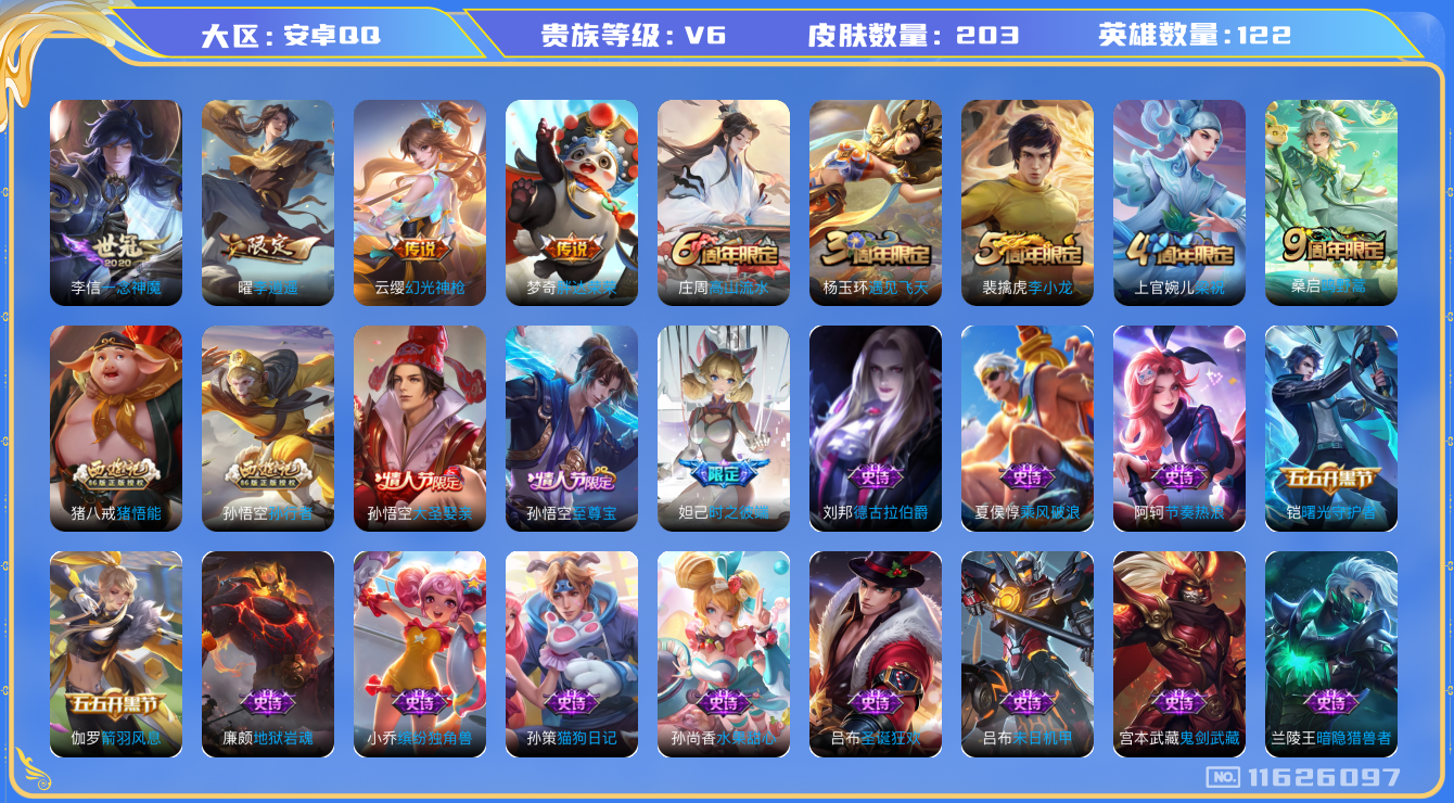 [11626097]V6 5传说 122英雄 203皮肤 可修改实名 优质装备:一念神魔,胖达荣荣,李逍遥 传说皮:幻光神枪 珍宝阁皮:胡桃夹子,蔷薇恋人 限定皮:鸣野蒿,至尊宝,时之彼端,遇见飞天,高山流水,梁祝,李小龙,孙行者,猪悟能,大圣娶亲 史诗皮:千年之狐,蒙恬荣光圣徽,偶像歌手,龙骑士(小龙虾),晚萤,末日机甲-吕布,猫狗日记-孙策,节奏热浪,修罗,女仆咖啡,水果甜心,功夫厨神,德古拉伯爵,暗隐猎兽者,鬼剑武藏,舞动绿茵,地狱岩魂,纤云弄巧,拒霜思,缤纷独角兽,乘风破浪,水晶猎龙者,曙光守护者,箭羽风息,金属风暴,原初追逐者,圣诞狂欢,鹰眼统帅,魅力维加斯,黎明之约,未来纪元-赵云
