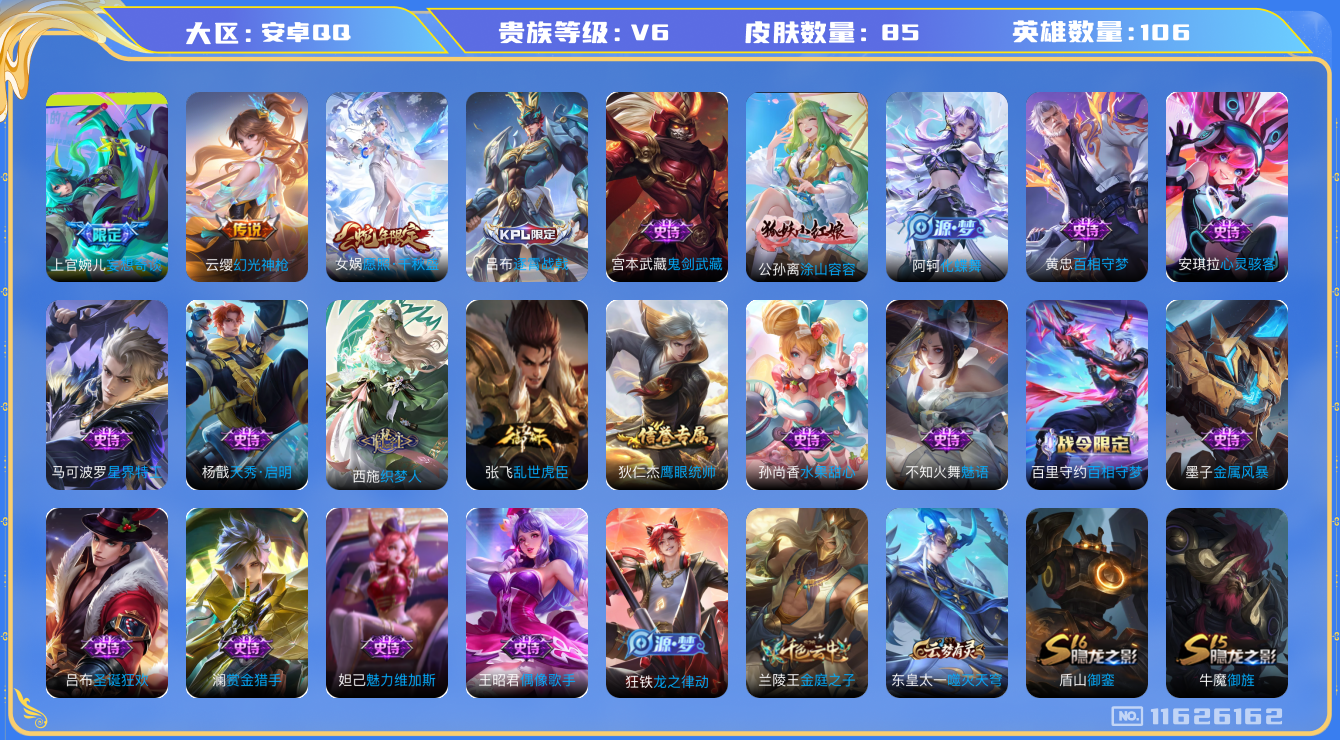 [11626162]V6 3传说 106英雄 85皮肤 可修改实名 女号 优质装备:妄想奇谈,涂山容容 传说皮:幻光神枪 限定皮:愿照·千秋盛(女娲年限),逐霄战戟 史诗皮:化蝶舞,龙之律动,百相守梦-百里守约,星界特工,百相守梦-黄忠,织梦人,魅语,偶像歌手,乱世虎臣,水果甜心,心灵骇客,鬼剑武藏,天秀·启明,金属风暴,圣诞狂欢,鹰眼统帅,魅力维加斯,赏金猎手