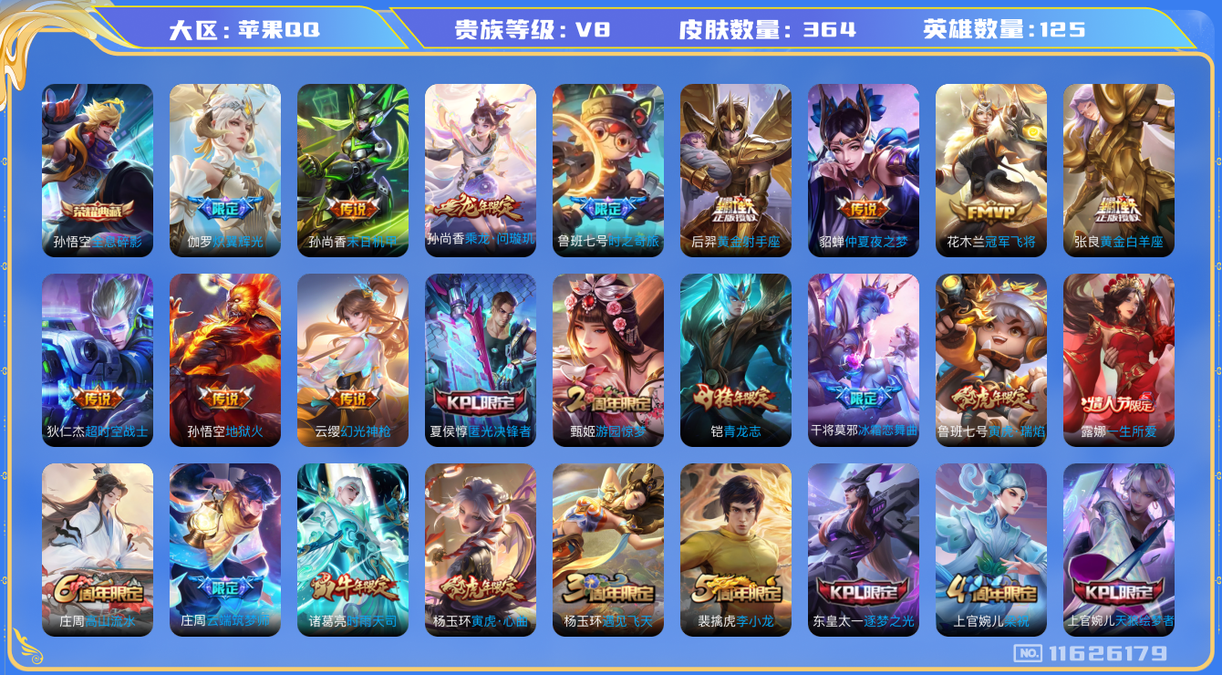 - [12265826]V9 3典藏 2无双 6珍品传说 27传说 125英雄 349皮肤 可修改实名 女号 优质装备:天鹅之梦(小乔典藏),鸣剑·曳影,弑枪猎影(韩信典藏),小乔时之魔女(小乔无双),器灵·螭龙剑,怪盗基德,器灵·落星盏,酷洛米之心,大耳狗之梦,黄金狮子座,黄金射手座,绛天战甲(鸡嘴战神),猫影幻舞,炽阳神光,一念神魔,地狱火,海洋之心,胖达荣荣,淬星耀世,电玩·雷克斯,鹤羽星尊,灼幽烈阳,鲁班七号-时之奇旅,澜逐花归海,玄雷天君,涂山容容 珍品传说:时之奇旅-孙策,兔狲·蓬尾 传说皮:九山相柳,幻光神枪 珍宝阁皮:胡桃夹子,万物之道,蔷薇恋人 限定皮:愿照·九州拓(澜年限),愿照·福禄聚(蔡文姬年限),愿照·岁时盈(虞姬年限),愿照·山河定(司空震年限),愿照·众生和(妲己年限),愿照·千秋盛(女娲年限),逐霄战戟,鸣野蒿,至尊宝,凤求凰(白切鸡),神威(电光马子),至美·乘鲤谣,高山流水,五谷丰年,冰锋战神,梁祝,御风骁将(吕布年限),李小龙,辉光之辰,如梦令-后羿,孙行者,猪悟能,蜜橘之夏,美猴王 史诗皮:鸭鸭历险记-刘禅,苍鳞隐世,器灵·浮梦炉,化蝶舞,灵蛊蚀心,星界战将,谪仙醉月,龙之律动,石田雨龙,百相守梦-周瑜,茶境仙,幻珠鲛人,破空之剑,蒙犽顽岩魄,百相守梦-百里守约,星界特工,百相守梦-黄忠,遇见神鹿,紫霞仙子,电玩小子(小书包),黄金分割率,特工魅影,千年之狐,永昼,江河有灵,匿光侦查者,真我赫兹(百里守约),魅语,百解令(蒙犽),高渐离燃音魔法,蒙恬荣光圣徽,无限星赏官,匿光破解者,冰冠公主,青蛇,偶像歌手,白蛇,电玩·爆裂旋风,暗夜猫娘,末日机甲-吕布,猫狗日记-孙策,猫狗日记-大乔,时之恋人-孙尚香,乱世虎臣,节奏热浪,修罗,女仆咖啡,摇滚巨星,水果甜心,绅士熊喵,星夜王子,心灵骇客,功夫厨神,德古拉伯爵,暗隐猎兽者,幽灵船长,鬼剑武藏,暗渊魔法,心灵战警,乐园奇幻夜,天秀·启明,舞动绿茵,地狱岩魂,诗语江南,纤云弄巧,缤纷独角兽,乘风破浪,逐浪之夏,月团寄思,水晶猎龙者,曙光守护者,箭羽风息,唤灵魅影,金属风暴,原初追逐者,圣诞狂欢,鹰眼统帅,暗夜贵公子,魅力维加斯,黎明之约,赏金猎手,未来纪元-赵云