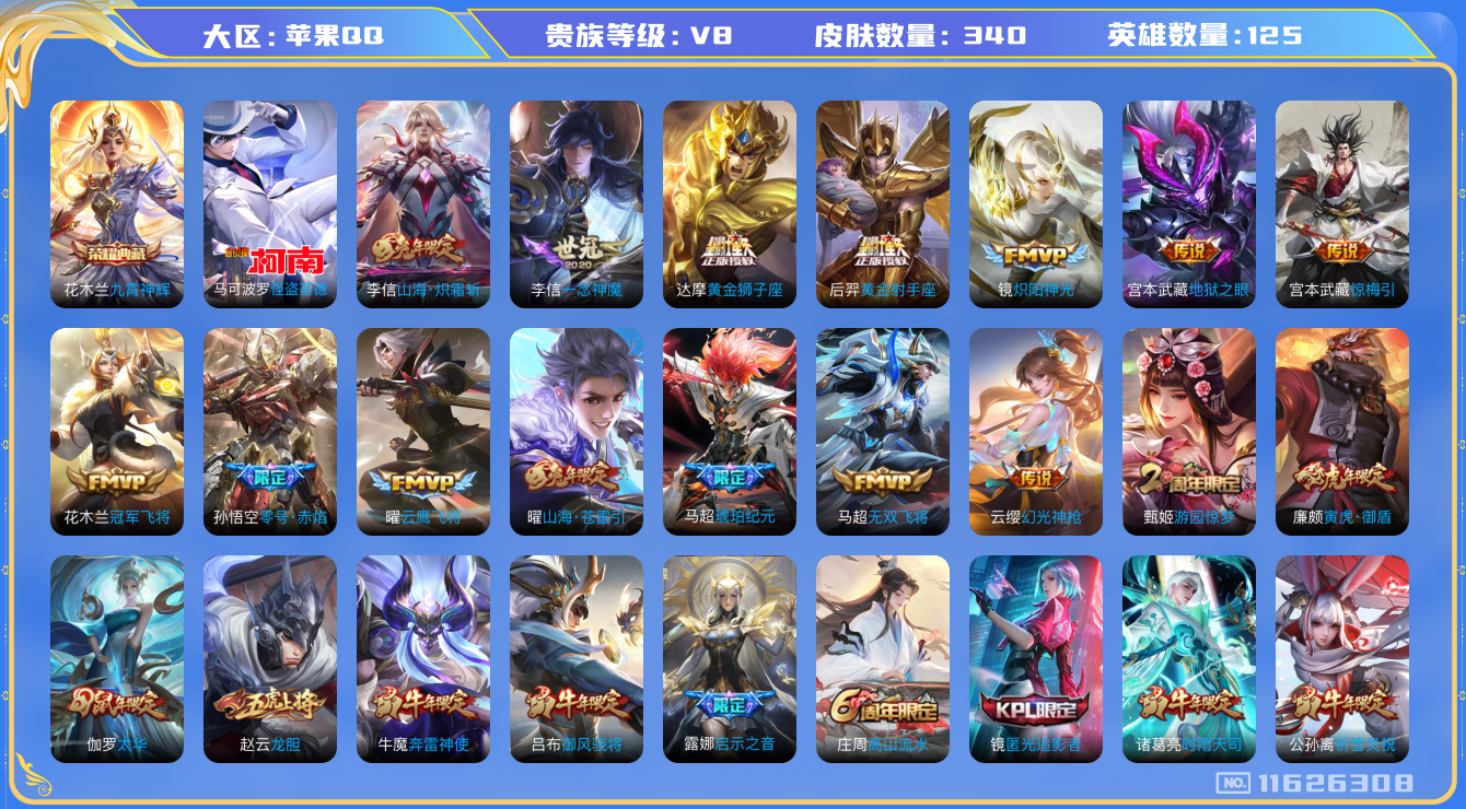 [11626308]V8 1典藏 1珍品传说 28传说 125英雄 340皮肤 可修改实名 优质装备:九霄神辉(木兰典藏),怪盗基德,黄金狮子座,黄金射手座,冠军飞将,云鹰飞将(小将军),炽阳神光,一念神魔,零号·赤焰,地狱之眼,无双飞将,山海·炽霜斩(李信年限),山海·苍雷引(电光曜子),惊梅引,琥珀纪元马超,涂山容容 传说皮:幻光神枪 珍宝阁皮:妄想食味,胡桃夹子,蔷薇恋人 限定皮:愿照·九州拓(澜年限),愿照·山河定(司空震年限),鸣野蒿,白虎志(电光耗子),凤求凰(白切鸡),太华(伽罗年限),时雨天司(水龙头),神威(电光马子),遇见飞天,高山流水,齐天大圣,五谷丰年,武圣,游园惊梦,梁祝,御风骁将(吕布年限),天狼狩猎者,龙胆,奔雷神使(牛魔年限),祈雪灵祝(雪兔子),李小龙,匿光追影者,寅虎·御盾(廉颇年限),寅虎·赤拳(老虎年限),启示之音,深海之息(深海大菠萝),山海·玄木吟(马可年限) 史诗皮:星界战将,龙之律动,石田雨龙,茶境仙,破空之剑,百相守梦-黄忠,紫霞仙子,电玩小子(小书包),特工魅影,千年之狐,永昼,江河有灵,高渐离燃音魔法,蒙恬荣光圣徽,偶像歌手,电玩·爆裂旋风,暗夜猫娘,龙骑士(小龙虾),末日机甲-吕布,猫狗日记-孙策,乱世虎臣,节奏热浪,修罗,女仆咖啡,水果甜心,绅士熊喵,天才门将,星夜王子,心灵骇客,功夫厨神,德古拉伯爵,暗隐猎兽者,幽灵船长,鬼剑武藏,暗渊魔法,心灵战警,地狱岩魂,纤云弄巧,繁星吟游(呼啦呼啦),拒霜思,缤纷独角兽,乘风破浪,逐浪之夏,水晶猎龙者,曙光守护者,热力回旋,箭羽风息,金属风暴,原初追逐者,圣诞狂欢,圣诞恋歌,鹰眼统帅,王者之锤,魅力维加斯,黎明之约,赏金猎手,寅虎·御盾,无心,未来纪元-赵云,玫瑰异探