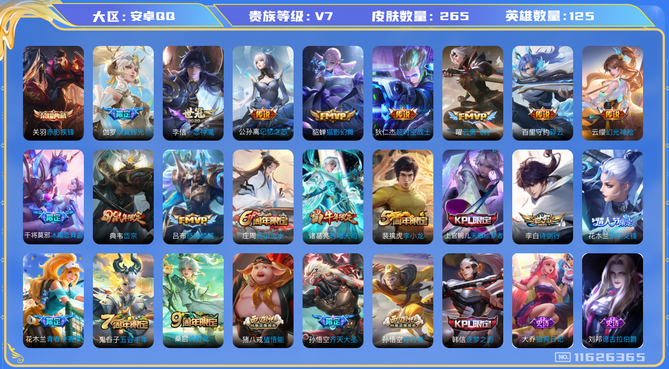 - [11823885]V8 2典藏 14传说 125英雄 325皮肤 可修改实名 优质装备:全息碎影(猴子典藏),幻阙歌(貂蝉典藏),黄金狮子座,云鹰飞将(小将军),炽阳神光,一念神魔,地狱火,零号·赤焰,时之恋人-刘备(电焊工) 传说皮:典韦战鼓燎原,幻光神枪 珍宝阁皮:优雅恋人,女武神 限定皮:鸣野蒿,至尊宝,白虎志(电光耗子),凤求凰(白切鸡),白晶晶,神威(电光马子),飞衡(韩信年限),瑞麟志(木兰年限),遇见飞天,高山流水,冰锋战神,游园惊梦,梁祝,御风骁将(吕布年限),烈魂,天狼绘梦者,李小龙,逐梦之光,朱雀志(守约年限),如梦令-嫦娥,如梦令-后羿,霸王别姬-虞姬,猪悟能,大圣娶亲,引擎之心,天魔缭乱,冰霜恋舞曲,美猴王,寅虎·御盾(廉颇年限) 史诗皮:龙之律动,石田雨龙,东方月初,百相守梦-黄忠,紫霞仙子,黄金分割率,永昼,江河有灵,鹤归松栖(赵怀真),蒙恬荣光圣徽,冰冠公主,晚萤,暗夜猫娘,龙骑士(小龙虾),末日机甲-吕布,猫狗日记-孙策,乱世虎臣,节奏热浪,修罗,女仆咖啡,摇滚巨星,水果甜心,绅士熊喵,天才门将,星夜王子,心灵骇客,功夫厨神,德古拉伯爵,暗隐猎兽者,幽灵船长,鬼剑武藏,心灵战警,舞动绿茵,纤云弄巧,繁星吟游(呼啦呼啦),缤纷独角兽,乘风破浪,逐浪之夏,水晶猎龙者,曙光守护者,箭羽风息,金属风暴,原初追逐者,圣诞狂欢,圣诞恋歌,鹰眼统帅,王者之锤,暗夜贵公子,魅力维加斯,黎明之约,赏金猎手,寅虎·御盾,无心,未来纪元-赵云