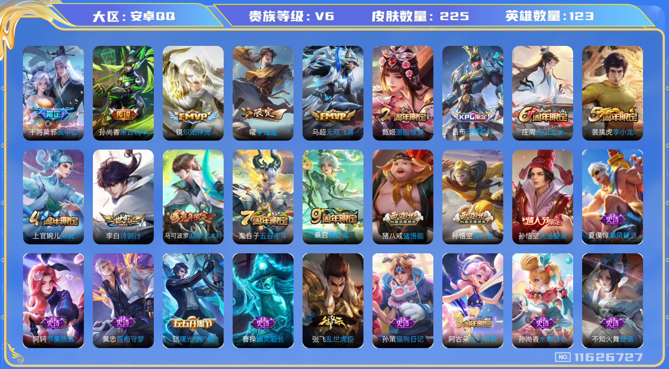 - PX_2051177-安卓V 【可二次】 英雄数量:115 皮肤数量:98 贵族等级:贵族V6 一念神魔 妄想食味 山海炽霜斩 埋骨钱 超元猎域 龙胆 山海玄木吟 诗剑行 末日机甲孙策 特工战影 街头霸王 赏金猎手 永昼 暗渊魔法 孙行者 修罗 电玩·爆裂旋风 无心 五谷丰年 冰冠公主 末日机甲男 魔术师 水果甜心 天才门将 鬼剑武藏 皇家上将 幽灵船长 金属风暴 炽热元素使 坚韧之力 海滩派对
