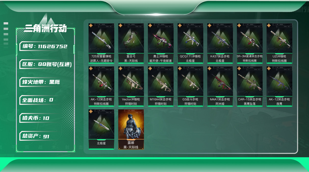 [11626752]总资产:91.1M 1干员外观 1近战传说 15传说枪械 哈夫币:10.158K 顶级安全箱(3×3)9.15号到期 可二次 可修改实名 优质装备:近战-北极星,顶级安全箱(3x3) 烽火地带段位:黑鹰 全面战场段位:统帅 传说武器皮肤:UZI冲锋枪-特斯拉线圈,M16A4突击步枪-狩猎时刻,AK-12突击步枪-特斯拉线圈,SR-3M紧凑突击步枪-特斯拉线圈,勇士冲锋枪-能天使-午夜邮差,Vector冲锋枪-狩猎时刻,G3战斗步枪-狩猎时刻,复合弓-黑-天际线,K437突击步枪-北极星,QCQ171冲锋枪-北极星,725双管霰弹枪-送葬人-无题密令,M4A1突击步枪-阿米娅,AK-12突击步枪-夜鹰,CAR-15突击步枪-黑鹰坠落 干员外观:露娜-黑·天际线