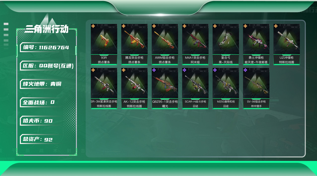 [11626764]总资产:92.9M 9传说枪械 哈夫币:90.123K 进阶安全箱(9.17到期) 可二次 可修改实名 烽火地带段位:青铜 全面战场段位:无段位 传说武器皮肤:M4A1突击步枪-阿米娅,复合弓-黑-天际线,AWM狙击步枪-捞点薯条,腾龙突击步枪-捞点薯条,93R-捞点薯条,AK-12突击步枪-特斯拉线圈,SR-3M紧凑突击步枪-特斯拉线圈,UZI冲锋枪-特斯拉线圈,勇士冲锋枪-能天使-午夜邮差 史诗武器皮肤:SV-98狙击步枪-林中猎手,M250通用机枪-囚徒,SCAR-H战斗步枪-囚徒,QBZ95-1突击步枪-曙光