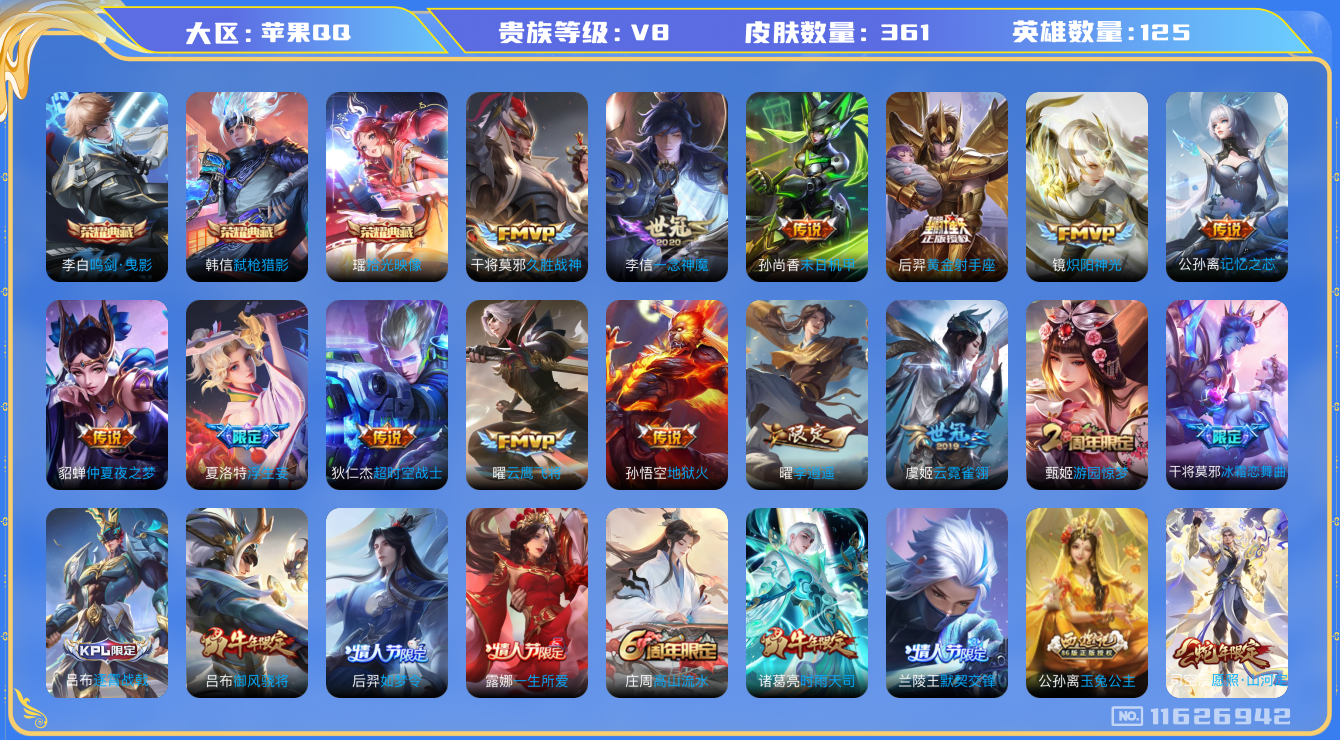 - [12025912]V9 1典藏 2珍品传说 22传说 126英雄 320皮肤 典藏英雄武则天 可修改实名 优质装备:幻阙歌(貂蝉典藏),怪盗基德,大耳狗之梦,黄金狮子座,黄金射手座,冠军飞将,云鹰飞将(小将军),久胜战神,一念神魔,末日机甲-孙尚香(绿蚂蚱),地狱火,海洋之心,地狱之眼,时之恋人-刘备(电焊工),游龙清影(小青龙),超时空战士-狄仁杰,无双飞将,霜月吟 传说皮:典韦战鼓燎原 珍宝阁皮:妄想食味 限定皮:愿照·九州拓(澜年限),逐霄战戟,鸣野蒿,至尊宝,白虎志(电光耗子),凤求凰(白切鸡),寅虎·展翼(孙膑年限),魔法小厨娘,神威(电光马子),飞衡(韩信年限),怒海麟威,梁祝,李小龙,逐梦之影,大圣娶亲,神奇女侠 史诗皮:鸭鸭历险记-刘禅,器灵·浮梦炉,化蝶舞,星界战将,龙之律动,布丁狗之誓,百相守梦-周瑜,茶境仙,幻珠鲛人,东方月初,蒙犽顽岩魄,埋骨钱,百相守梦-百里守约,百相守梦-黄忠,紫霞仙子,苍穹之光,白龙吟,黄金分割率,特工魅影,千年之狐,魅语,高渐离燃音魔法,无限星赏官,冰冠公主,青蛇,偶像歌手,龙骑士(小龙虾),末日机甲-吕布,猫狗日记-孙策,猫狗日记-大乔,节奏热浪,修罗,女仆咖啡,摇滚巨星,水果甜心,绅士熊喵,天才门将,星夜王子,心灵骇客,功夫厨神,德古拉伯爵,暗隐猎兽者,鬼剑武藏,乐园奇幻夜,天秀·启明,纤云弄巧,繁星吟游(呼啦呼啦),缤纷独角兽,乘风破浪,逐浪之夏,水晶猎龙者,曙光守护者,箭羽风息,原初追逐者,圣诞狂欢,圣诞恋歌,鹰眼统帅,魅力维加斯,黎明之约,未来纪元-赵云