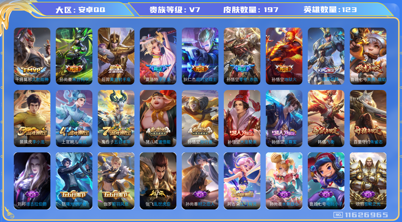 - [12078423]V9 1典藏 1无双 2珍品传说 28传说 126英雄 359皮肤 典藏英雄武则天 可修改实名 优质装备:九霄神辉(木兰典藏),器灵·螭龙剑,器灵·落星盏,黑崎一护,黄金狮子座,冠军飞将,久胜战神,一念神魔,地狱火,仲夏夜之梦(大飞蛾),零号·赤焰,海洋之心,地狱之眼,李逍遥,淬星耀世,画中仙,浮生妄,惊梅引,澜逐花归海 传说皮:乘龙·铭钟鼎(赵云年限),幻光神枪 珍宝阁皮:妄想食味,胡桃夹子,优雅恋人 限定皮:愿照·九州拓(澜年限),鸣野蒿,夏侯惇霜北刀,至尊宝,白虎志(电光耗子),凤求凰(白切鸡),异界灵契(白毛香),傲雪梅枪,时雨天司(水龙头),神威(电光马子),遇见飞天,高山流水,诗剑行,五谷丰年,冰锋战神,武圣,天狼运算者,梁祝,李小龙,逐梦之影,朱雀志(守约年限),默契交锋-花木兰,孙行者,猪悟能,大圣娶亲,天魔缭乱,青春决赛季,冰霜恋舞曲,匿光追影者 史诗皮:鸭鸭历险记-刘禅,器灵·浮梦炉,化蝶舞,星界战将,谪仙醉月,龙之律动,雪豹·霜爪,石田雨龙,茶境仙,破空之剑,上官婉儿群星魔术团,蔬乡物语(鲁班七号),星界特工,百相守梦-黄忠,紫霞仙子,苍穹之光,电玩小子(小书包),白龙吟,黄金分割率,特工魅影,千年之狐,江河有灵,魅语,百解令(蒙犽),高渐离燃音魔法,蒙恬荣光圣徽,无限星赏官,冰冠公主,青蛇,偶像歌手,暗夜猫娘,龙骑士(小龙虾),末日机甲-吕布,猫狗日记-孙策,猫狗日记-大乔,乱世虎臣,节奏热浪,修罗,女仆咖啡,摇滚巨星,水果甜心,绅士熊喵,星夜王子,心灵骇客,功夫厨神,德古拉伯爵,暗隐猎兽者,幽灵船长,鬼剑武藏,暗渊魔法,心灵战警,乐园奇幻夜,地狱岩魂,诗语江南,纤云弄巧,繁星吟游(呼啦呼啦),拒霜思,缤纷独角兽,乘风破浪,逐浪之夏,水晶猎龙者,曙光守护者,箭羽风息,金属风暴,原初追逐者,圣诞狂欢,圣诞恋歌,鹰眼统帅,暗夜贵公子,魅力维加斯,黎明之约,无心,未来纪元-赵云,玫瑰异探