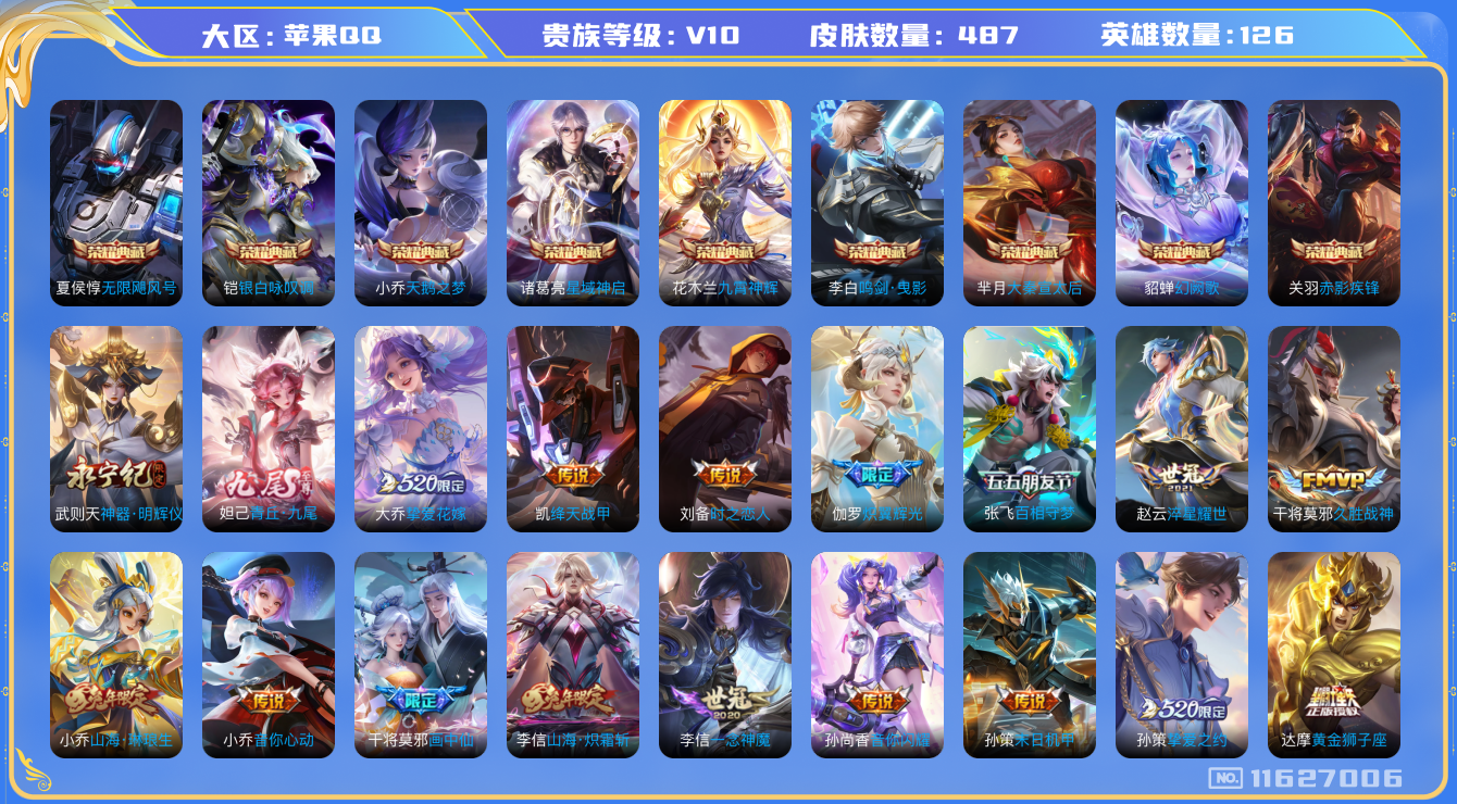 [11627006]V10 9典藏 2无双 68传说 126英雄 487皮肤 典藏英雄武则天 可修改实名 优质装备:天鹅之梦(小乔典藏),无限飓风号(高达),大秦宣太后,鸣剑·曳影,星域神启(倪克斯贼亮),九霄神辉(木兰典藏),赤影疾锋,银白咏叹调(倪克斯侍卫),幻阙歌(貂蝉典藏),神器·明辉仪,青丘·九尾(妲己无双),黄金狮子座,黄金射手座,冠军飞将,云鹰飞将(小将军),绛天战甲(鸡嘴战神),猫影幻舞,久胜战神,炽阳神光,一念神魔,云霓雀翎,末日机甲-孙尚香(绿蚂蚱),仲夏夜之梦(大飞蛾),音你心动-小乔,海洋之心,地狱之眼,飞鸢探春,音你心动-周瑜,胖达荣荣,李逍遥,时之恋人-刘备(电焊工),游龙清影(小青龙),淬星耀世,超时空战士-狄仁杰,遇见胡旋,末日机甲-孙策,挚爱之约,挚爱花嫁,无双飞将,音你闪耀(rap皮),碎云,天秀幻梦,神器·狴犴令,神器·明辉仪,山海·炽霜斩(李信年限),山海·琳琅生(小乔年限),山海·苍雷引(电光曜子),炽翼辉光(娃娃菜牛角包),燃星之曲,画中仙,浮生妄,记忆之芯(机甲兔),青丘·九尾,百相守梦(张飞),电玩·雷克斯,鹤羽星尊,惊梅引,鲁班七号-时之奇旅,艾琳觅芳踪 珍宝阁皮:优雅恋人,蔷薇恋人,女武神 限定皮:至尊宝,白虎志(电光耗子),凤求凰(白切鸡),凤凰于飞,太华(伽罗年限),梅西,武陵仙君(小桃花),异界灵契(白毛香),傲雪梅枪,补天,前尘镜,星穹之声,绯月行,时雨天司(水龙头),神威(电光马子),飞衡(韩信年限),山海·碧波行(瑶年限),无限倾心-项羽,遇见飞天,高山流水,诗剑行,无限倾心-虞姬,齐天大圣,匿光决锋者,怒海麟威,降魔,五谷丰年,青龙志(铠年限),冰锋战神,天狼运算者,游园惊梦,梁祝,天狼狩猎者,烈魂,岱宗(典韦年限),虎魄,逐梦之音,天狼绘梦者,李小龙,逐梦之影,玄武志(苏烈年限),朱雀志(守约年限),如梦令-嫦娥,如梦令-后羿,霸王别姬-项羽,圣诞老人,默契交锋-兰陵王,真爱至上,孙行者,猪悟能,引擎之心,天魔缭乱,蜜橘之夏,热情桑巴,神奇女侠,寅虎·赤拳(老虎年限),时之祈愿-云中君,玉兔公主,启示之音,无尽星芒,深海之息(深海大菠萝),唐三藏,枫霜尽,匿光启智者,时之奇旅-妲己,神器·万象笔,梦圆繁星,山海·玄木吟(马可年限),冰霜神祇 史诗皮:灵蛊蚀心,遇见神鹿,紫霞仙子,苍穹之光,电玩小子(小书包),白龙