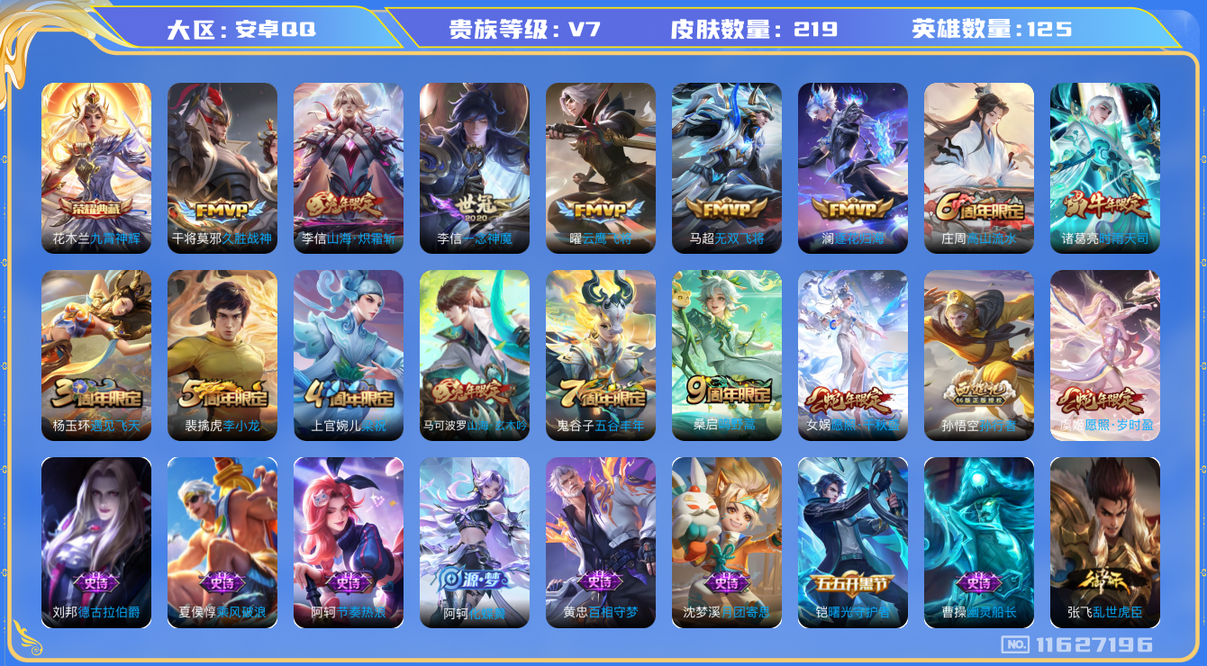 [11627196]V7 1典藏 10传说 125英雄 219皮肤 可修改实名 优质装备:九霄神辉(木兰典藏),云鹰飞将(小将军),久胜战神,一念神魔,无双飞将,山海·炽霜斩(李信年限),澜逐花归海 珍宝阁皮:妄想食味,蔷薇恋人,女武神 限定皮:愿照·岁时盈(虞姬年限),愿照·千秋盛(女娲年限),鸣野蒿,时雨天司(水龙头),遇见飞天,高山流水,五谷丰年,梁祝,李小龙,孙行者,山海·玄木吟(马可年限) 史诗皮:化蝶舞,星界战将,龙之律动,石田雨龙,谪仙醉月,百相守梦-黄忠,紫霞仙子,特工魅影,百相守梦(关羽),电玩·爆裂旋风,江河有灵,蒙恬荣光圣徽,偶像歌手,龙骑士(小龙虾),无限星赏官,末日机甲-吕布,猫狗日记-孙策,时之恋人-孙尚香,乱世虎臣,节奏热浪,修罗,女仆咖啡,摇滚巨星,水果甜心,绅士熊喵,天才门将,星夜王子,心灵骇客,时之奇旅-安琪拉,功夫厨神,德古拉伯爵,暗隐猎兽者,幽灵船长,鬼剑武藏,纤云弄巧,乘风破浪,逐浪之夏,月团寄思,水晶猎龙者,曙光守护者,金属风暴,圣诞恋歌,鹰眼统帅,魅力维加斯,无心,未来纪元-赵云