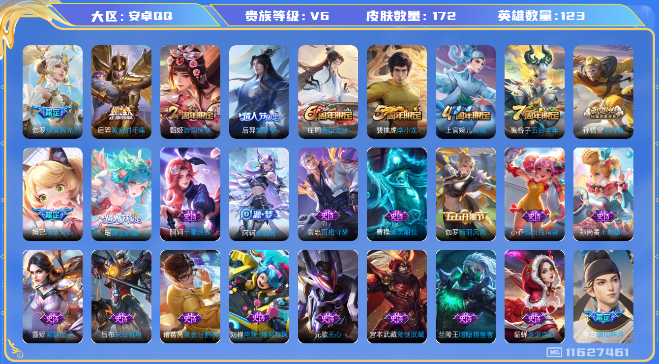 [11627461]V6 3传说 123英雄 172皮肤 可修改实名 女号 优质装备:黄金射手座,炽翼辉光(娃娃菜牛角包) 珍宝阁皮:蔷薇恋人,女武神 限定皮:高山流水,五谷丰年,游园惊梦,梁祝,李小龙,如梦令-后羿,孙行者,时之祈愿-瑶(瑶传限),时之奇旅-妲己 史诗皮:化蝶舞,谪仙醉月,百相守梦-黄忠,紫霞仙子,黄金分割率,千年之狐,电玩·爆裂旋风,晚萤,冰冠公主,末日机甲-吕布,节奏热浪,女仆咖啡,水果甜心,心灵骇客,功夫厨神,暗隐猎兽者,幽灵船长,鬼剑武藏,繁星吟游(呼啦呼啦),拒霜思,缤纷独角兽,逐浪之夏,箭羽风息,金属风暴,圣诞恋歌,鹰眼统帅,魅力维加斯,无心,未来纪元-赵云