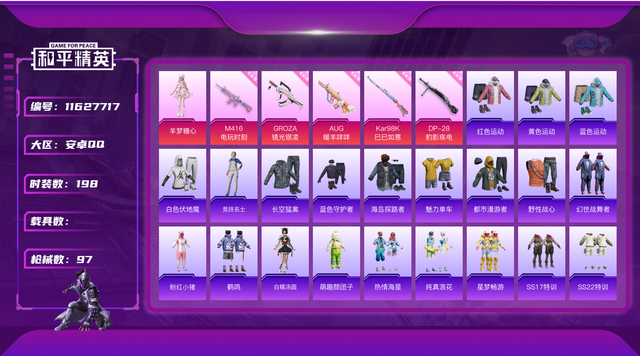 - PX_2083345- 苹果手Q-14王牌印记-14粉装-9特效枪-2载具-87552热力值-181套装-237枪皮-1卓越印记-1传奇印记 【14粉装】,梦幻火箭,缤纷油彩,繁龙极客,洛天依,怪诞乔克,恐龙拽拽,小可学妹,寒光使者,莲影清波,桀骜红莲,绚金战神,星之彼岸,机械师花傲天,烟云彩露 【9特效枪】AKM-绿萝繁花-5级 AKM-梦之光华-5级 SCAR-L-锦绣绵绵-5级 SCAR-L