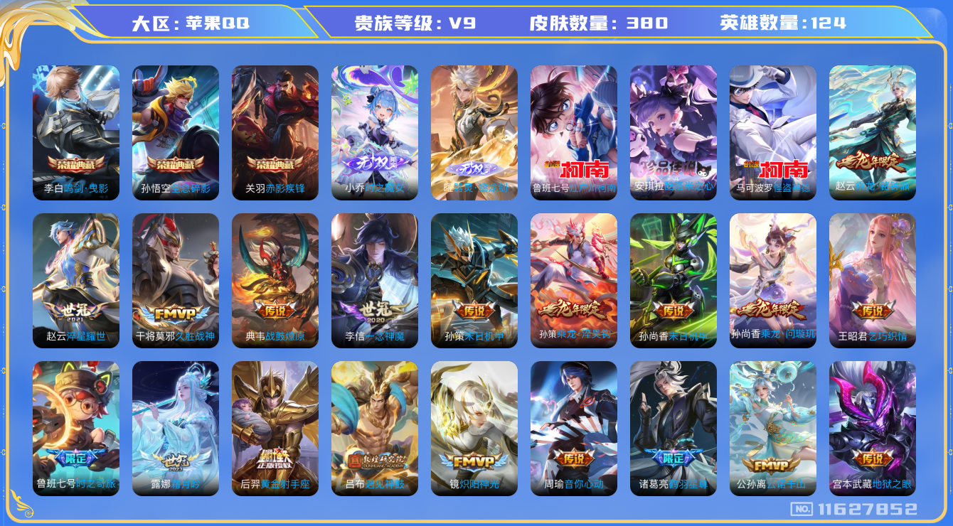 [11627852]V9 3典藏 2无双 3珍品传说 39传说 124英雄 380皮肤 可修改实名 优质装备:鸣剑·曳影,全息碎影(猴子典藏),赤影疾锋,小乔时之魔女(小乔无双),器灵·螭龙剑,江户川柯南,怪盗基德,酷洛米之心,黄金射手座,冠军飞将,云鹰飞将(小将军),久胜战神,炽阳神光,一念神魔,末日机甲-孙尚香(绿蚂蚱),地狱火,仲夏夜之梦(大飞蛾),地狱之眼,音你心动-周瑜,胖达荣荣,乞巧织情,淬星耀世,超时空战士-狄仁杰,末日机甲-孙策,无双飞将,碎云,鹤羽星尊,妄想实况,惊梅引,遇见神鼓,鲁班七号-时之奇旅,霜月吟,澜逐花归海,琥珀纪元马超 传说皮:乘龙·问璇玑(孙尚香年限),乘龙·铭钟鼎(赵云年限),乘龙·淬吴钩(孙策年限),典韦战鼓燎原,云诺千山,祥瑞亨通 珍宝阁皮:妄想食味,优雅恋人,玩趣恶龙 限定皮:愿照·众生和(妲己年限),映山客,鸣野蒿,夏侯惇霜北刀,至尊宝,凤求凰(白切鸡),神威(电光马子),飞衡(韩信年限),五谷丰年,冰锋战神,武圣,天狼运算者,游园惊梦,梁祝,御风骁将(吕布年限),烈魂,天狼征服者,李小龙,朱雀志(守约年限),如梦令-后羿,霸王别姬-虞姬,孙行者,猪悟能,大圣娶亲,冰霜恋舞曲,神器·万象笔 史诗皮:鸭鸭历险记-刘禅,绮世丹青,化蝶舞,龙之律动,茶境仙,破空之剑,琥珀纪元伽罗,蔬乡物语(鲁班七号),乘龙·聚宝船(安琪拉年限),乘龙·忆丹青(大乔年限),百相守梦-百里守约,遇见神鹿,紫霞仙子,电玩小子(小书包),白龙吟,黄金分割率,特工魅影,千年之狐,江河有灵,高渐离燃音魔法,蒙恬荣光圣徽,冰冠公主,青蛇,偶像歌手,白蛇,电玩·爆裂旋风,暗夜猫娘,百相守梦(关羽),龙骑士(小龙虾),末日机甲-吕布,猫狗日记-孙策,猫狗日记-大乔,乱世虎臣,节奏热浪,修罗,女仆咖啡,摇滚巨星,水果甜心,天才门将,星夜王子,心灵骇客,功夫厨神,德古拉伯爵,暗隐猎兽者,幽灵船长,鬼剑武藏,心灵战警,乐园奇幻夜,舞动绿茵,地狱岩魂,纤云弄巧,繁星吟游(呼啦呼啦),缤纷独角兽,乘风破浪,逐浪之夏,月团寄思,水晶猎龙者,曙光守护者,箭羽风息,金属风暴,原初追逐者,圣诞狂欢,圣诞恋歌,鹰眼统帅,魅力维加斯,无心,未来纪元-赵云