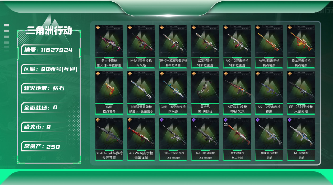 [11627924]总资产:250.1M 1干员外观 16传说枪械 哈夫币:9.713K 顶级安全箱(3×3)9.15号到期 可二次 可修改实名 优质装备:顶级安全箱(3x3) 烽火地带段位:钻石 全面战场段位:校官 传说武器皮肤:SR-25射手步枪-水墨云图,AS Val突击步枪-蛇年祥瑞,SCAR-H战斗步枪-铁艺苍穹,UZI冲锋枪-特斯拉线圈,AWM狙击步枪-捞点薯条,腾龙突击步枪-捞点薯条,93R-捞点薯条,AK-12突击步枪-特斯拉线圈,SR-3M紧凑突击步枪-特斯拉线圈,勇士冲锋枪-能天使-午夜邮差,复合弓-黑-天际线,725双管霰弹枪-送葬人-无题密令,M4A1突击步枪-阿米娅,CAR-15突击步枪-阿米娅,AK-12突击步枪-夜鹰,M7战斗步枪-神秘艺术 史诗武器皮肤:K416突击步枪-潜袭者,勇士冲锋枪-私人定制(典藏),SR-3M紧凑突击步枪-英雄,QBZ95-1突击步枪-ACE,AUG突击步枪-特勤执行,M4A1突击步枪-特勤执行,Vector冲锋枪-红色彗星,PTR-32战斗步枪-ACE,SKS射手步枪-ACE,AUG突击步枪-蝮蛇,M700狙击步枪-蝮蛇,PKM通用机枪-蝮蛇,SR-25射手步枪-战场英杰,G3战斗步枪-战场英杰,M16A4突击步枪-竞赛选手,MP5冲锋枪-深海恐惧,勇士冲锋枪-深海恐惧,SG552突击步枪-深海恐惧,AKM突击步枪-林中猎手,QJB201轻机枪-Old Habits,SV-98狙击步枪-林中猎手,AS Val突击步枪-典狱官,PKM通用机枪-荒野求生,M250通用机枪-囚徒,SV-98狙击步枪-囚徒,SCAR-H战斗步枪-囚徒,腾龙突击步枪-无垢,MP7冲锋枪-无垢,PSG-1射手步枪-无垢,SVD狙击步枪-荒野求生,SR-3M紧凑突击步枪-荒野求生,QBZ95-1突击步枪-曙光,沙漠之鹰-曙光,Vector冲锋枪-阿萨拉文明,SVD狙击步枪-阿萨拉工艺,S12K霰弹枪-曙光,PKM通用机枪-英雄,M700狙击步枪-竞技风,QSZ92G-风林火山,93R-博士,PTR-32突击步枪-Old Habits 干员外观:蜂医-送葬人·无题密令(S5)