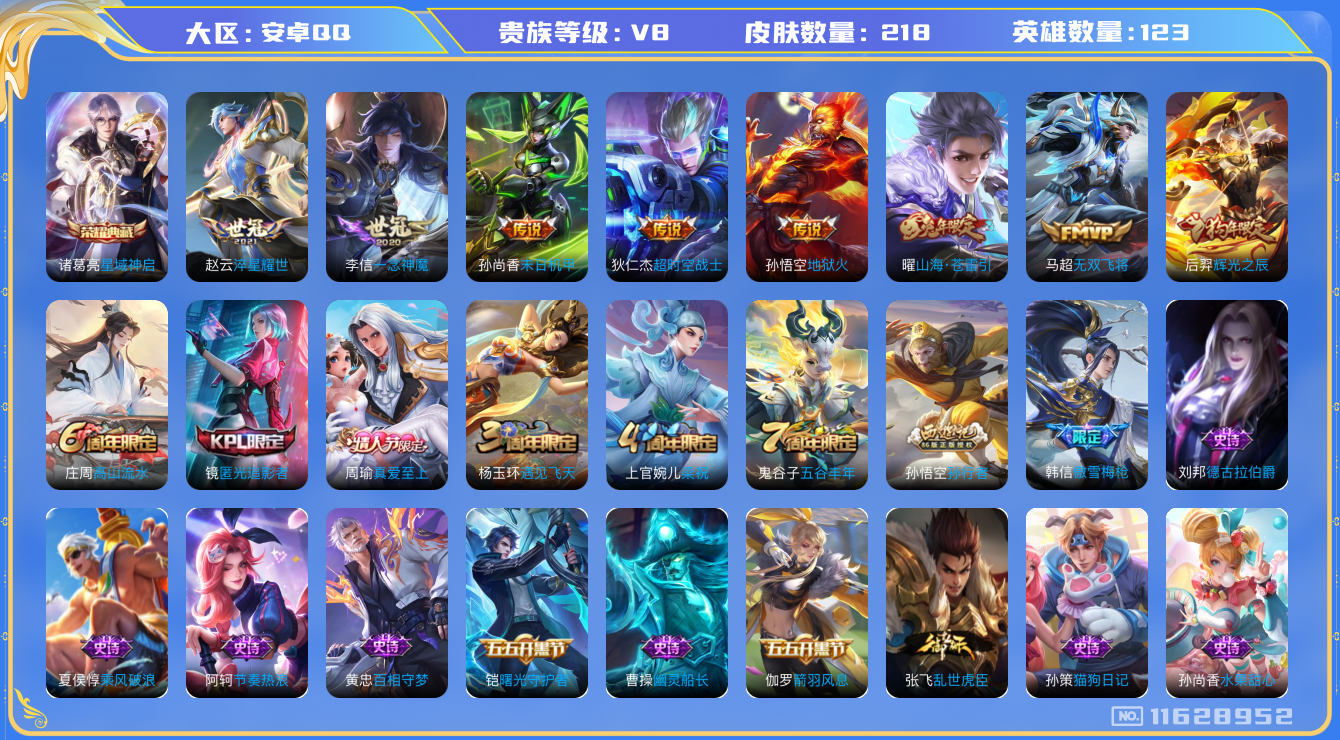 [11628952]V8 1典藏 8传说 123英雄 218皮肤 可修改实名 优质装备:星域神启(倪克斯贼亮),一念神魔,末日机甲-孙尚香(绿蚂蚱),地狱火,淬星耀世,超时空战士-狄仁杰,无双飞将,山海·苍雷引(电光曜子) 珍宝阁皮:胡桃夹子,玩趣恶龙 限定皮:傲雪梅枪,遇见飞天,高山流水,五谷丰年,梁祝,辉光之辰,真爱至上,孙行者,匿光追影者 史诗皮:百相守梦-百里守约,星界特工,百相守梦-黄忠,紫霞仙子,苍穹之光,电玩小子(小书包),黄金分割率,特工魅影,千年之狐,江河有灵,蒙恬荣光圣徽,冰冠公主,龙骑士(小龙虾),末日机甲-吕布,猫狗日记-孙策,乱世虎臣,节奏热浪,摇滚巨星,水果甜心,绅士熊喵,星夜王子,心灵骇客,功夫厨神,德古拉伯爵,暗隐猎兽者,幽灵船长,鬼剑武藏,心灵战警,乘风破浪,逐浪之夏,水晶猎龙者,曙光守护者,箭羽风息,金属风暴,原初追逐者,圣诞狂欢,圣诞恋歌,鹰眼统帅,魅力维加斯,黎明之约,无心,未来纪元-赵云
