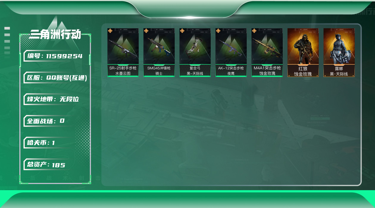 [11599254]总资产:185.7M 2干员外观 5传说枪械 哈夫币:1.407K 可二次 可修改实名 烽火地带段位:无段位 全面战场段位:无段位 传说武器皮肤:SR-25射手步枪-水墨云图,SMG45冲锋枪-骑士,复合弓-黑-天际线,AK-12突击步枪-夜鹰,M4A1突击步枪-蚀金玫瑰 干员外观:红狼-蚀金玫瑰,露娜-黑·天际线