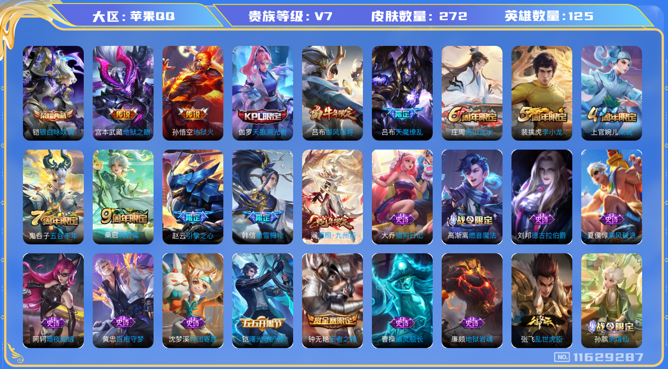 [11629287]V7 1典藏 5传说 125英雄 272皮肤 可修改实名 优质装备:银白咏叹调(倪克斯侍卫),地狱火,地狱之眼 珍宝阁皮:妄想食味,玩趣恶龙 限定皮:愿照·九州拓(澜年限),鸣野蒿,傲雪梅枪,高山流水,五谷丰年,梁祝,御风骁将(吕布年限),天狼溯光者,李小龙,引擎之心,天魔缭乱 史诗皮:鸭鸭历险记-刘禅,星界战将,茶境仙,蔬乡物语(鲁班七号),百相守梦-百里守约,百相守梦-黄忠,紫霞仙子,电玩小子(小书包),黄金分割率,特工魅影,千年之狐,江河有灵,雪夜绮愿(周瑜),百解令(蒙犽),高渐离燃音魔法,蒙恬荣光圣徽,偶像歌手,暗夜猫娘,猫狗日记-孙策,猫狗日记-大乔,乱世虎臣,修罗,女仆咖啡,摇滚巨星,水果甜心,天才门将,心灵骇客,功夫厨神,德古拉伯爵,暗隐猎兽者,幽灵船长,鬼剑武藏,心灵战警,乐园奇幻夜,天秀·启明,舞动绿茵,地狱岩魂,纤云弄巧,繁星吟游(呼啦呼啦),拒霜思,缤纷独角兽,乘风破浪,月团寄思,水晶猎龙者,曙光守护者,金属风暴,原初追逐者,圣诞狂欢,圣诞恋歌,鹰眼统帅,王者之锤,暗夜贵公子,魅力维加斯,黎明之约