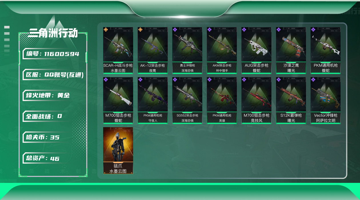 [11600594]总资产:46.1M 1干员外观 2传说枪械 哈夫币:35.785K 可二次 可修改实名 烽火地带段位:黄金 全面战场段位:无段位 传说武器皮肤:SCAR-H战斗步枪-水墨云图,AK-12突击步枪-夜鹰 史诗武器皮肤:PKM通用机枪-蝮蛇,AUG突击步枪-蝮蛇,M700狙击步枪-蝮蛇,PKM通用机枪-守夜人,勇士冲锋枪-深海恐惧,SG552突击步枪-深海恐惧,AKM突击步枪-林中猎手,沙漠之鹰-曙光,Vector冲锋枪-阿萨拉文明,S12K霰弹枪-曙光,PKM通用机枪-英雄,M700狙击步枪-竞技风 干员外观:骇爪-水墨云图