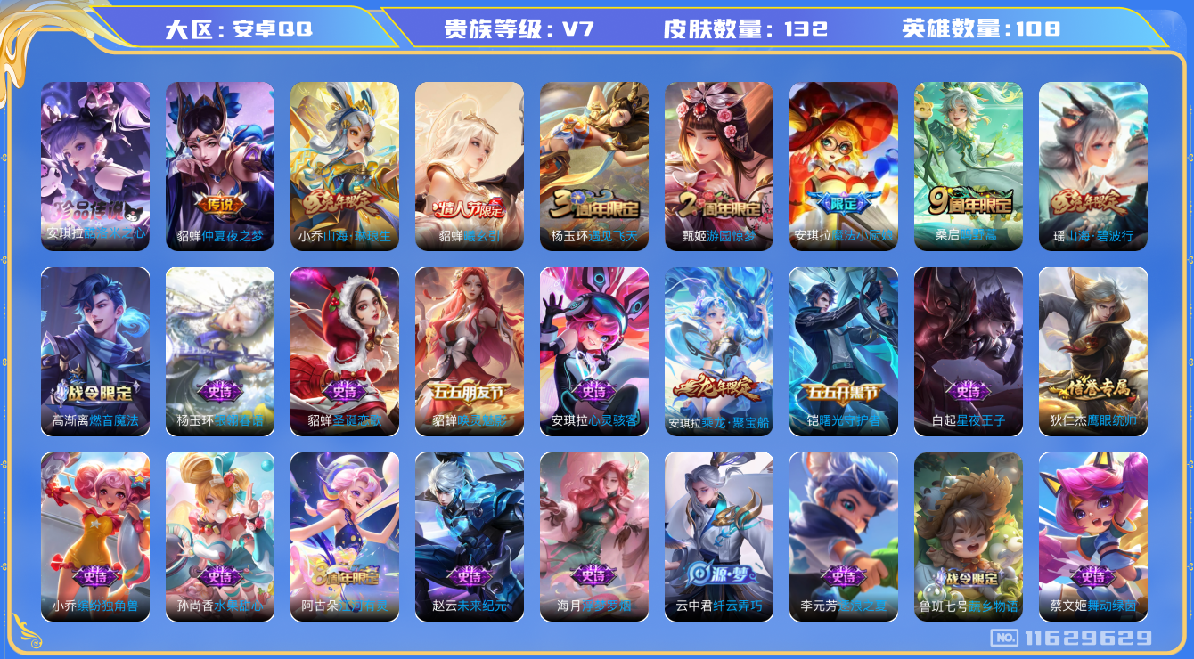 [11629629]V7 1珍品传说 4传说 108英雄 132皮肤 可修改实名 女号 优质装备:酷洛米之心,仲夏夜之梦(大飞蛾),山海·琳琅生(小乔年限) 传说皮:貂蝉曦玄引 珍宝阁皮:蔷薇恋人 限定皮:鸣野蒿,魔法小厨娘,山海·碧波行(瑶年限),遇见飞天,游园惊梦 史诗皮:鸭鸭历险记-刘禅,蔬乡物语(鲁班七号),乘龙·聚宝船(安琪拉年限),江河有灵,浮梦罗烟,高渐离燃音魔法,电玩·爆裂旋风,银翎春语,女仆咖啡,水果甜心,星夜王子,心灵骇客,舞动绿茵,纤云弄巧,缤纷独角兽,逐浪之夏,曙光守护者,唤灵魅影,圣诞恋歌,鹰眼统帅,魅力维加斯,未来纪元-赵云