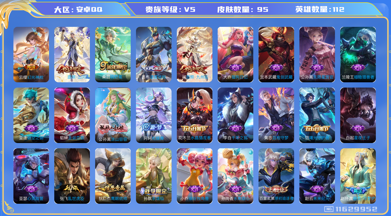 [11629952]V6 4传说 112英雄 95皮肤 可修改实名 优质装备:涂山容容 传说皮:幻光神枪 限定皮:愿照·九州拓(澜年限),愿照·山河定(司空震年限),逐霄战戟,鸣野蒿 史诗皮:器灵·浮梦炉,化蝶舞,龙之律动,茶境仙,破空之剑,百相守梦-黄忠,紫霞仙子,特工魅影,千年之狐,无限星赏官,末日机甲-吕布,猫狗日记-大乔,乱世虎臣,女仆咖啡,水果甜心,星夜王子,暗隐猎兽者,鬼剑武藏,心灵战警,缤纷独角兽,逐浪之夏,水晶猎龙者,曙光守护者,原初追逐者,圣诞狂欢,圣诞恋歌,鹰眼统帅,未来纪元-赵云