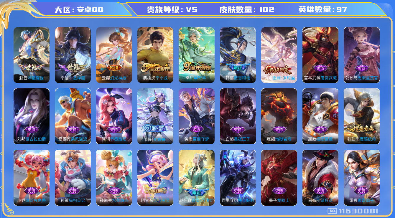 [11630081]V5 5传说 97英雄 102皮肤 可修改实名 优质装备:一念神魔,淬星耀世 传说皮:幻光神枪 珍宝阁皮:蔷薇恋人 限定皮:愿照·岁时盈(虞姬年限),鸣野蒿,傲雪梅枪,李小龙 史诗皮:器灵·浮梦炉,化蝶舞,龙之律动,百相守梦-黄忠,紫霞仙子,特工魅影,江河有灵,无限星赏官,偶像歌手,龙骑士(小龙虾),猫狗日记-孙策,节奏热浪,修罗,摇滚巨星,水果甜心,天才门将,星夜王子,德古拉伯爵,鬼剑武藏,地狱岩魂,缤纷独角兽,乘风破浪,圣诞狂欢,鹰眼统帅,魅力维加斯