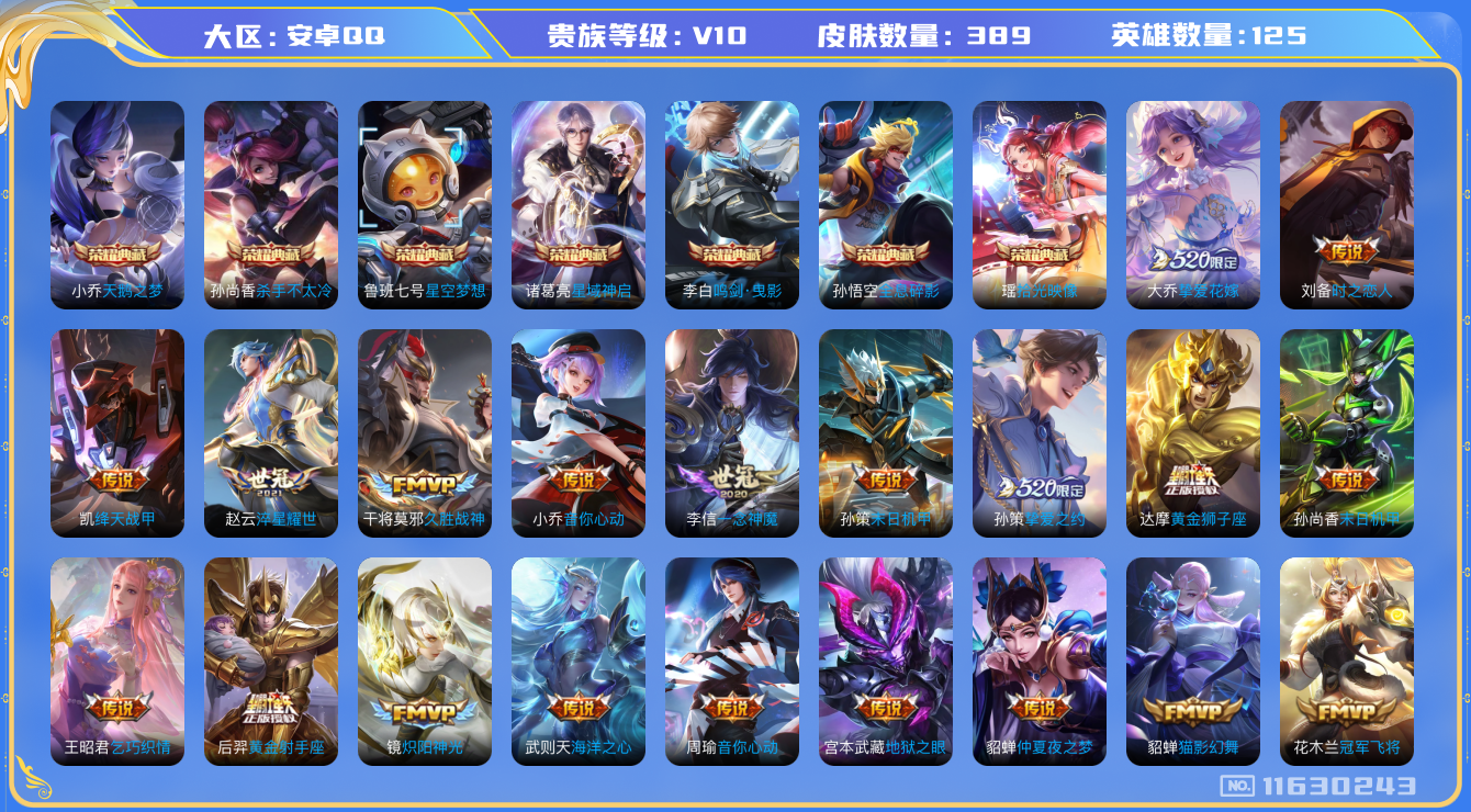 [11630243]V10 7典藏 38传说 125英雄 389皮肤 典藏英雄武则天 可修改实名 连体和平 优质装备:天鹅之梦(小乔典藏),星空梦想(太空人),杀手不太冷,鸣剑·曳影,全息碎影(猴子典藏),星域神启(倪克斯贼亮),拾光映像(瑶典藏),黄金狮子座,黄金射手座,冠军飞将,云鹰飞将(小将军),绛天战甲(鸡嘴战神),黄金白羊座,猫影幻舞,久胜战神,炽阳神光,一念神魔,云霓雀翎,末日机甲-孙尚香(绿蚂蚱),地狱火,仲夏夜之梦(大飞蛾),音你心动-小乔,海洋之心,地狱之眼,飞鸢探春,音你心动-周瑜,胖达荣荣,李逍遥,乞巧织情,时之恋人-刘备(电焊工),游龙清影(小青龙),淬星耀世,超时空战士-狄仁杰,末日机甲-孙策,花朝如约(花篮子),挚爱之约,挚爱花嫁,无双飞将,艾琳觅芳踪 珍宝阁皮:胡桃夹子,万物之道,蔷薇恋人 限定皮:鸣野蒿,至尊宝,凤求凰(白切鸡),武陵仙君(小桃花),时雨天司(水龙头),神威(电光马子),飞衡(韩信年限),遇见飞天,高山流水,匿光决锋者,五谷丰年,青龙志(铠年限),游园惊梦,梁祝,御风骁将(吕布年限),龙胆,天狼溯光者,天狼绘梦者,李小龙,逐梦之影,朱雀志(守约年限),如梦令-嫦娥,霸王别姬-项羽,霸王别姬-虞姬,默契交锋-花木兰,孙行者,猪悟能,大圣娶亲,引擎之心,百木心枪,玉兔公主,启示之音 史诗皮:灵蛊蚀心,星界战将,遇见神鹿,紫霞仙子,苍穹之光,电玩小子(小书包),白龙吟,黄金分割率,特工魅影,千年之狐,永昼,江河有灵,魅语,蒙恬荣光圣徽,无限星赏官,冰冠公主,青蛇,偶像歌手,白蛇,晚萤,暗夜猫娘,龙骑士(小龙虾),末日机甲-吕布,猫狗日记-孙策,猫狗日记-大乔,时之恋人-孙尚香,乱世虎臣,节奏热浪,修罗,女仆咖啡,摇滚巨星,水果甜心,绅士熊喵,天才门将,星夜王子,心灵骇客,时之奇旅-安琪拉,功夫厨神,德古拉伯爵,暗隐猎兽者,幽灵船长,鬼剑武藏,暗渊魔法,心灵战警,乐园奇幻夜,天秀·启明,舞动绿茵,地狱岩魂,诗语江南,纤云弄巧,拒霜思,缤纷独角兽,乘风破浪,逐浪之夏,龙鼓争鸣,月团寄思,水晶猎龙者,曙光守护者,热力回旋,箭羽风息,唤灵魅影,金属风暴,原初追逐者,圣诞狂欢,圣诞恋歌,鹰眼统帅,王者之锤,暗夜贵公子,魅力维加斯,黎明之约,雪上飞焰,赏金猎手,奇遇舞章,天秀·音浪,无心,