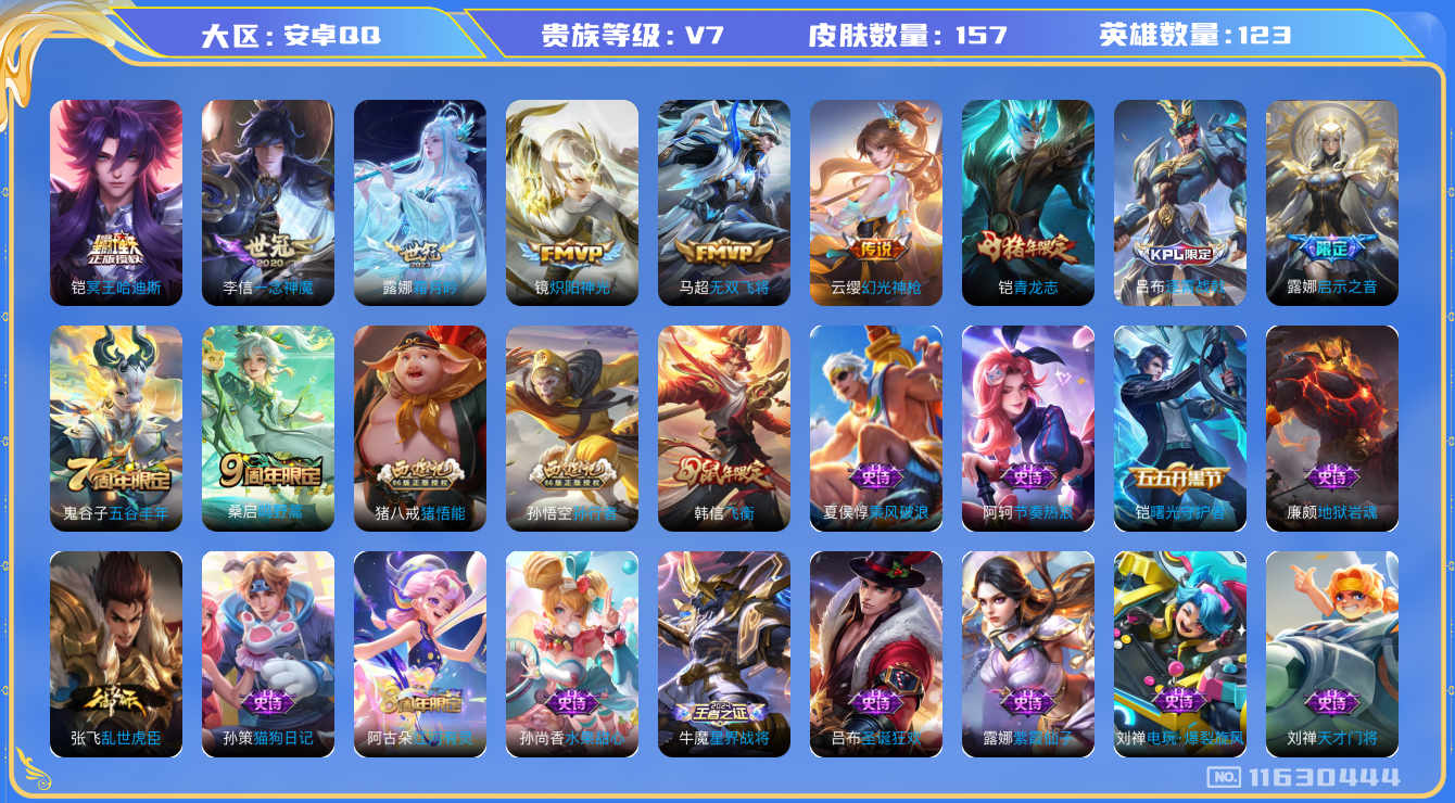 [11630444]V7 8传说 123英雄 157皮肤 可修改实名 优质装备:炽阳神光,一念神魔,无双飞将,霜月吟,涂山容容 传说皮:铠冥王哈迪斯,幻光神枪 珍宝阁皮:蔷薇恋人,玩趣恶龙 限定皮:逐霄战戟,鸣野蒿,飞衡(韩信年限),五谷丰年,青龙志(铠年限),孙行者,猪悟能,启示之音 史诗皮:星界战将,龙之律动,芈月浮光幕影,星界特工,紫霞仙子,特工魅影,千年之狐,江河有灵,冰冠公主,电玩·爆裂旋风,猫狗日记-孙策,乱世虎臣,节奏热浪,水果甜心,绅士熊喵,天才门将,星夜王子,功夫厨神,暗隐猎兽者,鬼剑武藏,心灵战警,舞动绿茵,地狱岩魂,纤云弄巧,乘风破浪,逐浪之夏,水晶猎龙者,曙光守护者,金属风暴,原初追逐者,圣诞狂欢,鹰眼统帅,魅力维加斯,无心,未来纪元-赵云