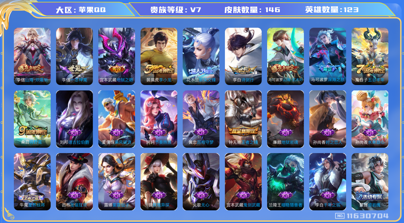 [11630704]V7 6传说 123英雄 146皮肤 可修改实名女号 优质装备:一念神魔,地狱之眼,山海·炽霜斩(李信年限) 珍宝阁皮:玩趣恶龙 限定皮:鸣野蒿,诗剑行,五谷丰年,李小龙,默契交锋-花木兰,深海之息(深海大菠萝),山海·玄木吟(马可年限) 史诗皮:星界战将,蒙犽顽岩魄,百相守梦-黄忠,紫霞仙子,千年之狐,偶像歌手,时之恋人-孙尚香,节奏热浪,女仆咖啡,水果甜心,星夜王子,德古拉伯爵,暗隐猎兽者,鬼剑武藏,舞动绿茵,地狱岩魂,乘风破浪,逐浪之夏,圣诞狂欢,鹰眼统帅,王者之锤,魅力维加斯,赏金猎手,无心,未来纪元-赵云,玫瑰异探
