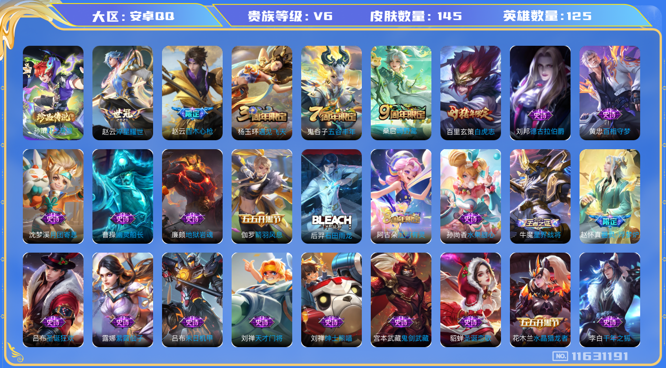 [11631191]V6 1珍品传说 3传说 125英雄 145皮肤 可修改实名 优质装备:淬星耀世 珍品传说:时之奇旅-孙策 珍宝阁皮:优雅恋人,玩趣恶龙 限定皮:鸣野蒿,白虎志(电光耗子),遇见飞天,五谷丰年,百木心枪 史诗皮:器灵·浮梦炉,星界战将,石田雨龙,蒙犽顽岩魄,百相守梦-黄忠,紫霞仙子,特工魅影,千年之狐,江河有灵,蒙恬荣光圣徽,偶像歌手,末日机甲-吕布,修罗,女仆咖啡,摇滚巨星,水果甜心,绅士熊喵,天才门将,星夜王子,心灵骇客,德古拉伯爵,幽灵船长,鬼剑武藏,舞动绿茵,地狱岩魂,逐浪之夏,月团寄思,水晶猎龙者,箭羽风息,金属风暴,圣诞狂欢,圣诞恋歌,鹰眼统帅,魅力维加斯,黎明之约,未来纪元-赵云