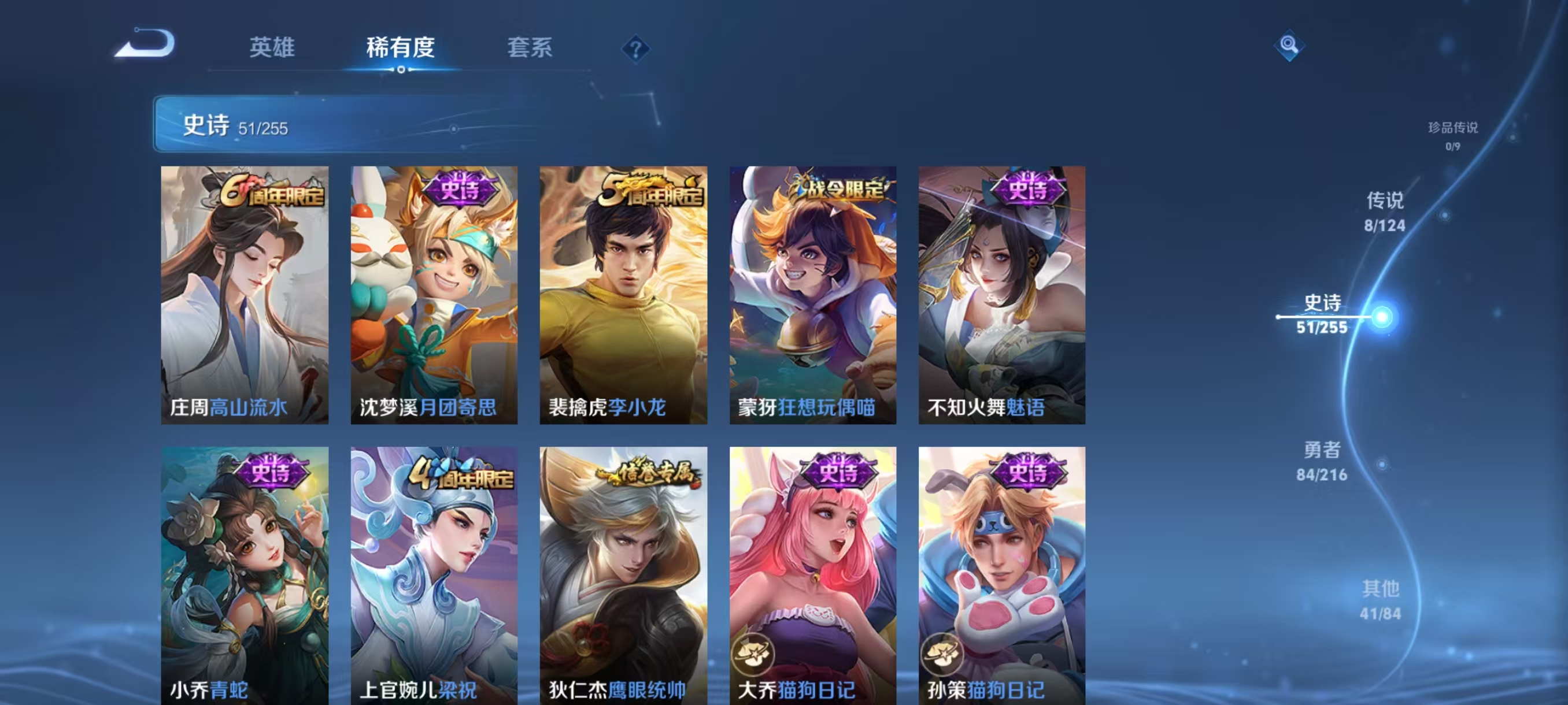 - PX_2093848-实名: 可修改 贵族等级: V7 英雄数: 123 皮肤数: 249 荣耀水晶: 星域神启 珍品传说: 怪盗基德,器灵·落星盏 传说皮: 久胜战神,一念神魔,乞巧织情,铠冥王哈迪斯 限定皮: 李小龙,梁祝,神威,至尊宝,孙行者,五谷丰年,鸣野蒿,陌上桑,愿照·山河定