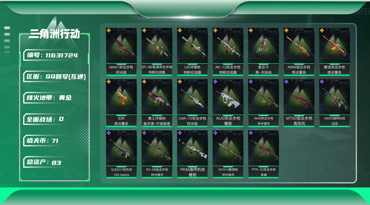 [11631724]总资产:83.1M 10传说枪械 哈夫币:71.018K 进阶安全箱(2×2)9.15号到期 可二次 可修改实名 烽火地带段位:黄金 全面战场段位:无段位 传说武器皮肤:UZI冲锋枪-特斯拉线圈,AWM狙击步枪-捞点薯条,腾龙突击步枪-捞点薯条,93R-捞点薯条,AK-12突击步枪-特斯拉线圈,SR-3M紧凑突击步枪-特斯拉线圈,勇士冲锋枪-能天使-午夜邮差,复合弓-黑-天际线,M4A1突击步枪-阿米娅,CAR-15突击步枪-阿米娅 史诗武器皮肤:PKM通用机枪-蝮蛇,AUG突击步枪-蝮蛇,QJB201轻机枪-Old Habits,M1014霰弹枪-林中猎手,AKM突击步枪-林中猎手,M250通用机枪-囚徒,SV-98狙击步枪-林中猎手,PTR-32突击步枪-英雄,M700狙击步枪-竞技风