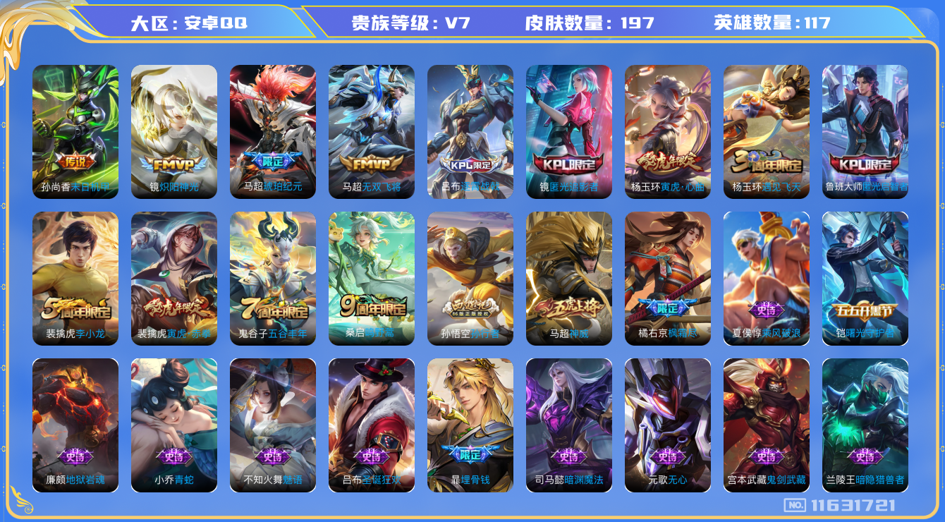 [11631721]V7 7传说 117英雄 197皮肤 可修改实名 优质装备:炽阳神光,末日机甲-孙尚香(绿蚂蚱),无双飞将,琥珀纪元马超 珍宝阁皮:蔷薇恋人 限定皮:逐霄战戟,鸣野蒿,神威(电光马子),遇见飞天,五谷丰年,李小龙,孙行者,匿光追影者,寅虎·心曲(虎婆),寅虎·赤拳(老虎年限),枫霜尽,匿光启智者 史诗皮:埋骨钱,决胜骁骑,魅语,青蛇,偶像歌手,晚萤,修罗,女仆咖啡,心灵骇客,暗隐猎兽者,鬼剑武藏,暗渊魔法,舞动绿茵,地狱岩魂,纤云弄巧,繁星吟游(呼啦呼啦),拒霜思,乘风破浪,水晶猎龙者,曙光守护者,金属风暴,原初追逐者,圣诞狂欢,鹰眼统帅,魅力维加斯,黎明之约,无心