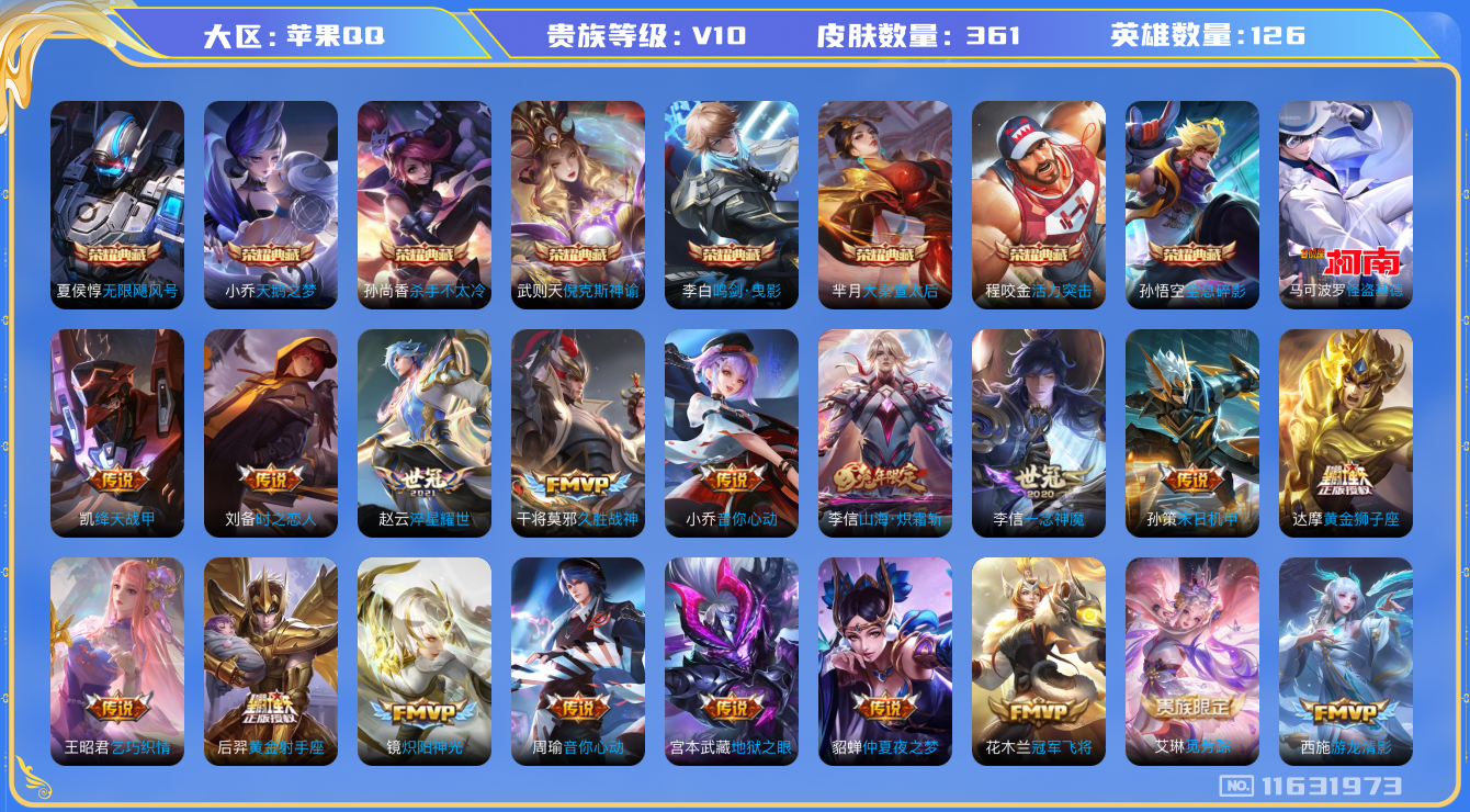 [11631973]V10 8典藏 1珍品传说 44传说 126英雄 361皮肤 典藏英雄武则天 可修改实名 优质装备:天鹅之梦(小乔典藏),倪克斯神谕(宇宙婆娘),无限飓风号(高达),活力突击,杀手不太冷,大秦宣太后,鸣剑·曳影,全息碎影(猴子典藏),怪盗基德,黄金狮子座,黄金射手座,冠军飞将,云鹰飞将(小将军),绛天战甲(鸡嘴战神),黄金白羊座,久胜战神,炽阳神光,一念神魔,云霓雀翎,地狱火,仲夏夜之梦(大飞蛾),音你心动-小乔,零号·赤焰,地狱之眼,飞鸢探春,音你心动-周瑜,胖达荣荣,李逍遥,乞巧织情,时之恋人-刘备(电焊工),游龙清影(小青龙),淬星耀世,超时空战士-狄仁杰,末日机甲-孙策,无双飞将,山海·炽霜斩(李信年限),艾琳觅芳踪,玄雷天君,涂山容容 传说皮:幻光神枪 珍宝阁皮:胡桃夹子,蔷薇恋人 限定皮:愿照·九州拓(澜年限),愿照·岁时盈(虞姬年限),逐霄战戟,鸣野蒿,至尊宝,白虎志(电光耗子),凤求凰(白切鸡),凤凰于飞,太华(伽罗年限),傲雪梅枪,白鹤梁神女,白晶晶,时雨天司(水龙头),高山流水,怒海麟威,青龙志(铠年限),冰锋战神,武圣,天狼运算者,梁祝,御风骁将(吕布年限),龙胆,逐梦之星,岱宗(典韦年限),天狼溯光者,奔雷神使(牛魔年限),祈雪灵祝(雪兔子),李小龙,逐梦之影,逐梦之光,朱雀志(守约年限),永曜之星,辉光之辰,如梦令-嫦娥,如梦令-后羿,霸王别姬-项羽,霸王别姬-虞姬,奇迹圣诞,默契交锋-兰陵王,默契交锋-花木兰,孙行者,大圣娶亲,青春决赛季,冰霜恋舞曲,乒乒小将,蜜橘之夏,神奇女侠,寅虎·御盾(廉颇年限),寅虎·心曲(虎婆),寅虎·赤拳(老虎年限) 史诗皮:赞萌露比,苍鳞隐世,绮世丹青,龙之律动,百相守梦-周瑜,织梦人,守夜人,遇见神鹿,紫霞仙子,苍穹之光,电玩小子(小书包),白龙吟,黄金分割率,特工魅影,千年之狐,永昼,魅语,百解令(蒙犽),无限星赏官,冰冠公主,偶像歌手,白蛇,晚萤,龙骑士(小龙虾),末日机甲-吕布,猫狗日记-孙策,猫狗日记-大乔,时之恋人-孙尚香,乱世虎臣,节奏热浪,修罗,女仆咖啡,摇滚巨星,水果甜心,绅士熊喵,天才门将,星夜王子,心灵骇客,功夫厨神,德古拉伯爵,暗隐猎兽者,幽灵船长,鬼剑武藏,暗渊魔法,心灵战警,天秀·启明,舞动绿茵,地狱岩魂,诗语江南,纤云弄巧,拒霜思,缤纷独角兽,乘风破浪,逐浪之夏,龙鼓争鸣,