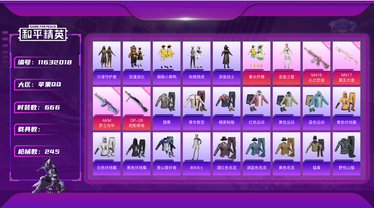 [11632018]2粉装 4特效枪 8印记 可二次 可修改实名 身法装备:暗影哥特(红眼罩),沙漠守护者 优质装备:沙漠守护者(黑丝),M416心之恋语,香水柠檬,AKM梦之光华,M417第五大道 热门装扮:圣堂之誓,沙漠守护者,软萌银虎,浪客战士,潮萌小黄鸭,浪漫波比 稀有枪皮:DP-28-豹影疾电 六级特效枪:六级M416-心之恋语,六级M417-第五大道 五级特效枪:五级DP-28-豹影疾电,五级AKM-梦之光华 紫色装扮:SS22特训,SS23特训,幻彩翩翩,娇憨猪猪,萌趣咩咩,SS21特训,浪漫假日,人气偶像,冰川特警,冷焰舞者,刚毅裁决者,千禧之恋,霓虹热舞,SS33特训套装,青涩时光,SS20特训,青春冒险家,潮流游乐家,SS15特训,迪迦奥特曼,SS16特训,银白舞王,SS13特训,治愈之星,科技之星,SS14特训,萌趣颜团子,特种颜团子,海龙战士,飞驰魅影,音速流光,SS19特训,吉莉礼服,天籁歌者,瑞龙福将,团圆交子,SS17特训,极乐追光,异彩先驱,缤纷焰火,SS18特训,都市魅力,酒红色名流,酷潮明星,野性山猫,野性战心,长空猛禽,雪山精英,霓虹极客,霓虹街区,青年教官,风暴特警,缤纷果语,耀动青春,耀眼新星,蓝彩潮人,蓝色运动,虎虎生威吉莉,街头潮人,风行保卫者,飞行日记,魅力单车,鹤鸣,麻辣教官,黄色伏地魔,黄色名流,黄色运动,黑色伏地魔,龙的传人,龟仙人,龙魂突击队,沙漠毒蛇,极速红龙,柠萌假日,格斗先锋,橘黑制服,沙漠兵团,暗金炫舞,海岛探路者,深蓝色名流,清新柠檬,幻影武者,坚韧舞者,夏日音浪,夜莺强袭者,完美偶像,帅气教官,幻世战舞者,战地督导,探宝勇士,湖蓝色名流,绮丽涂鸦,登山爱好者,白熊同盟,白色伏地魔,破晓战魂,破蛋小黄鸡,福星高照,空岛之星,空投萌叽,竞技勇士朋克,竞技达人朋克,红色运动,甜蜜熊情侣,王牌教练,牛气冲天,灼焰舞者,灿烂千阳,炫蓝之夏,热血青春,牛气满满,猛禽,特殊使命,特训学院,猎鹰,镭射皇者,多纳泰罗,星途旅人,热情海星,SS28特训,玉兔迎春,青团波波,竞技名士,暗影哥特(红眼罩),情公主,果汁能量,惊鸿侠骨,神气柴柴,SS24特训(SS24特训套装),SS25特训,锦衣飞扬,焰鹰斗篷,幻羽潜行,SS27特训,华灯初上,SS26特训,春光漫游,快闪甜心,萌主吾皇,精神漫游,核芯基因,深蓝冒险家,迷域探索者,顽皮玉兔,黑