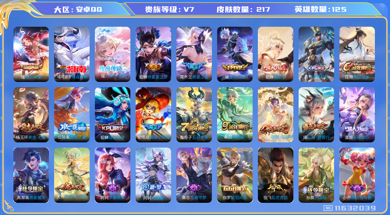 [11632039]V7 1典藏 2珍品传说 7传说 125英雄 217皮肤 可修改实名 优质装备:拾光映像(瑶典藏),怪盗基德,大耳狗之梦,仲夏夜之梦(大飞蛾),燃星之曲,澜逐花归海 传说皮:貂蝉曦玄引 珍宝阁皮:妄想食味 限定皮:愿照·福禄聚(蔡文姬年限),逐霄战戟,鸣野蒿,魔法小厨娘,山海·碧波行(瑶年限),高山流水,无限倾心-虞姬,五谷丰年,逐梦之音,蜜橘之夏,寅虎·心曲(虎婆) 史诗皮:鸭鸭历险记-刘禅,器灵·浮梦炉,化蝶舞,星界战将,龙之律动,茶境仙,炽弈燎原,破空之剑,涂山红红,蒙犽顽岩魄,乘龙·忆丹青(大乔年限),百相守梦-百里守约,百相守梦-黄忠,织梦人,遇见神鹿,紫霞仙子,百解令(蒙犽),高渐离燃音魔法,青蛇,晚萤,末日机甲-吕布,时之恋人-孙尚香,乱世虎臣,节奏热浪,女仆咖啡,摇滚巨星,水果甜心,绅士熊喵,天才门将,星夜王子,心灵骇客,鬼剑武藏,心灵战警,舞动绿茵,诗语江南,纤云弄巧,拒霜思,缤纷独角兽,逐浪之夏,水晶猎龙者,箭羽风息,金属风暴,圣诞恋歌,鹰眼统帅,魅力维加斯