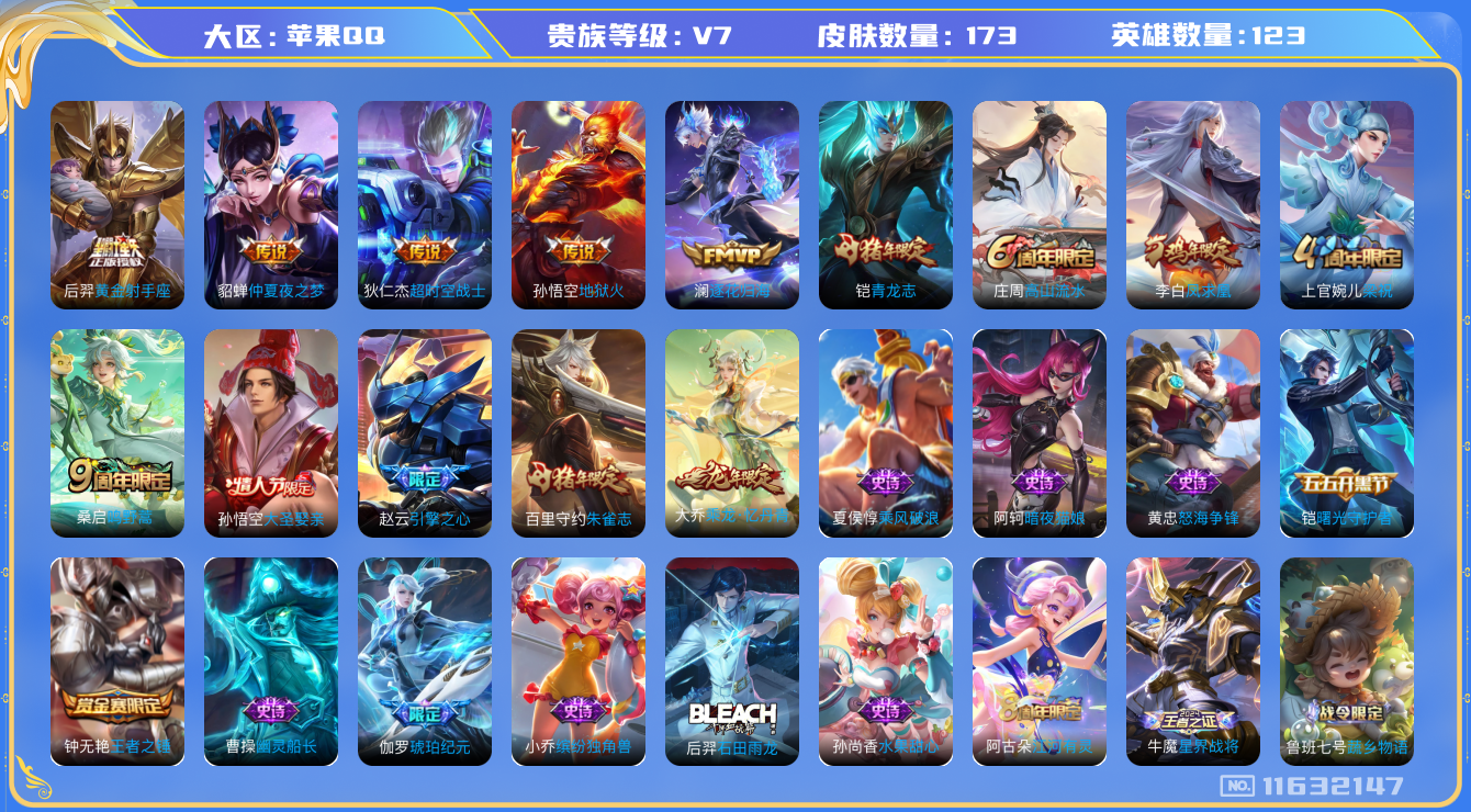 - PX_2027649-贵族等级: V7 英雄数: 123 皮肤数: 170 传说皮: 冠军飞将,仲夏夜之梦,山海·苍雷引,妄想实况,澜逐花归海,幻光神枪,祥瑞亨通 限定皮: 冰锋战神,李小龙,梁祝,烈魂,神威,飞衡,五谷丰年,神器·万象笔,山海·玄木吟,齐天大圣,鸣野蒿,逐霄战戟,愿照·千秋盛