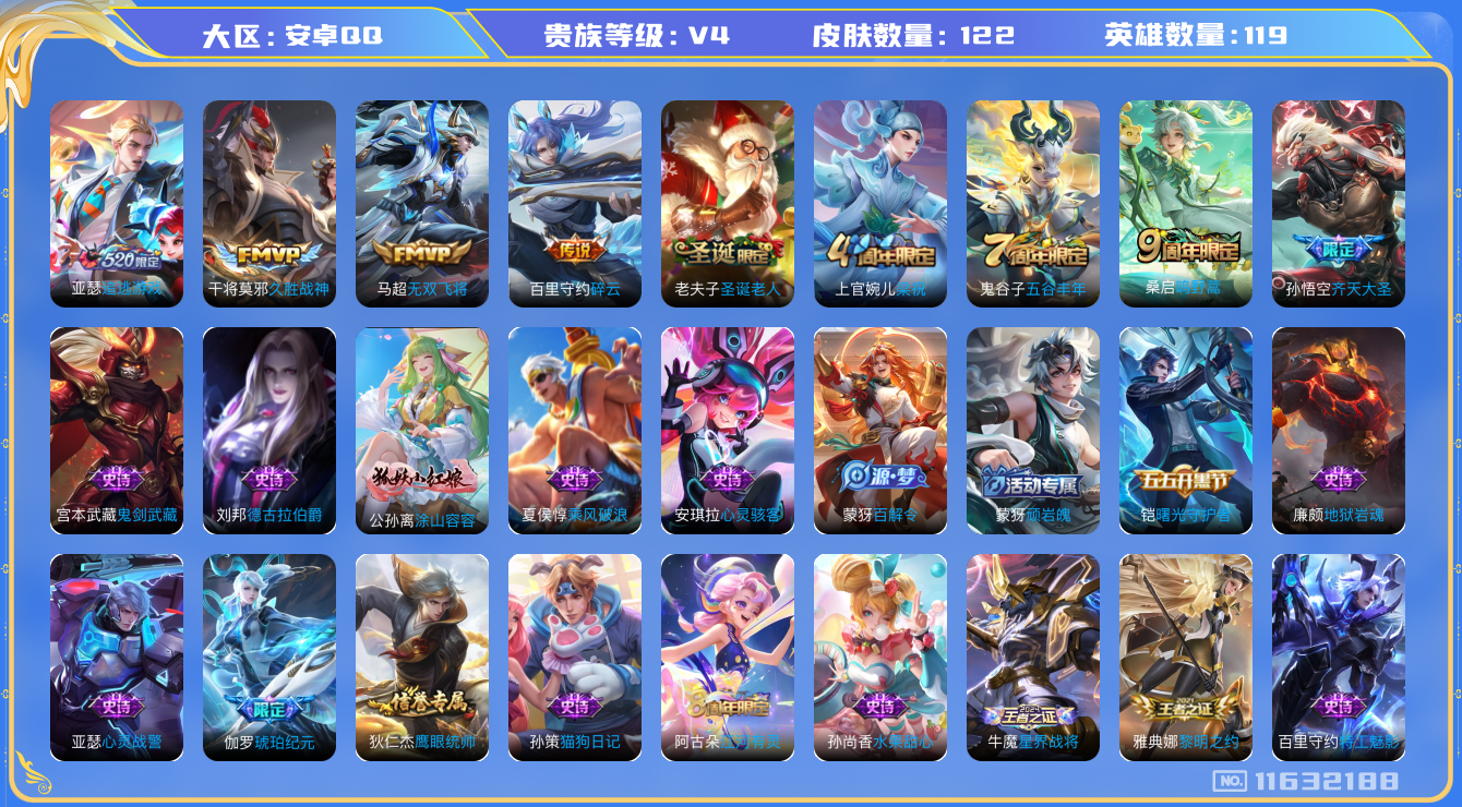 [11632188]V4 6传说 119英雄 122皮肤 可修改实名 优质装备:久胜战神,无双飞将,碎云,追逃游戏(亚瑟),涂山容容 珍宝阁皮:妄想食味,蔷薇恋人 限定皮:鸣野蒿,齐天大圣,五谷丰年,梁祝,圣诞老人 史诗皮:星界战将,蒙犽顽岩魄,琥珀纪元伽罗,黄金分割率,特工魅影,江河有灵,百解令(蒙犽),蒙恬荣光圣徽,猫狗日记-孙策,女仆咖啡,水果甜心,心灵骇客,德古拉伯爵,鬼剑武藏,心灵战警,地狱岩魂,拒霜思,乘风破浪,曙光守护者,金属风暴,鹰眼统帅,魅力维加斯,黎明之约