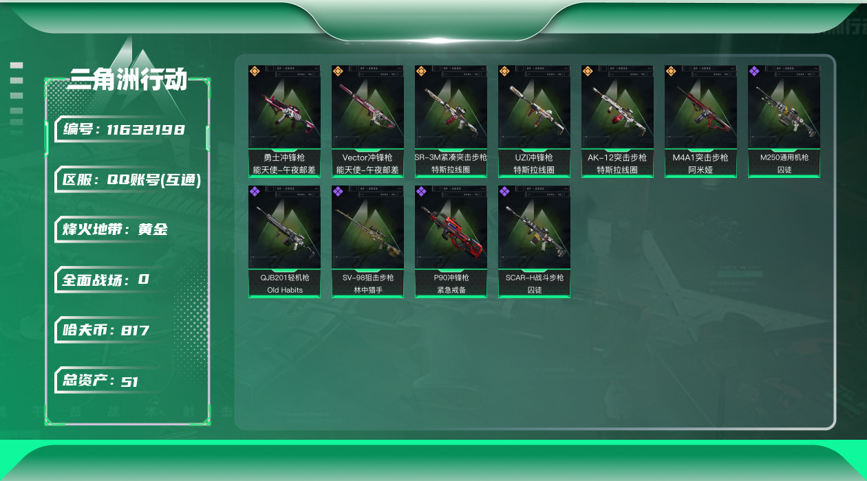[11632198]总资产:51.3M 6传说枪械 哈夫币:817.145K 可二次 可修改实名 烽火地带段位:黄金 全面战场段位:无段位 传说武器皮肤:UZI冲锋枪-特斯拉线圈,AK-12突击步枪-特斯拉线圈,SR-3M紧凑突击步枪-特斯拉线圈,勇士冲锋枪-能天使-午夜邮差,Vector冲锋枪-能天使-午夜邮差,M4A1突击步枪-阿米娅 史诗武器皮肤:QJB201轻机枪-Old Habits,M250通用机枪-囚徒,SV-98狙击步枪-林中猎手,SCAR-H战斗步枪-囚徒,P90冲锋枪-紧急戒备