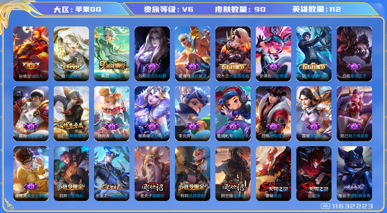 [11632223]V6 3传说 112英雄 90皮肤 可修改实名 优质装备:炽阳神光,地狱火 限定皮:鸣野蒿 史诗皮:紫霞仙子,电玩小子(小书包),黄金分割率,冰冠公主,摇滚巨星,水果甜心,星夜王子,心灵骇客,德古拉伯爵,乘风破浪,逐浪之夏,水晶猎龙者,曙光守护者,圣诞狂欢,鹰眼统帅,魅力维加斯