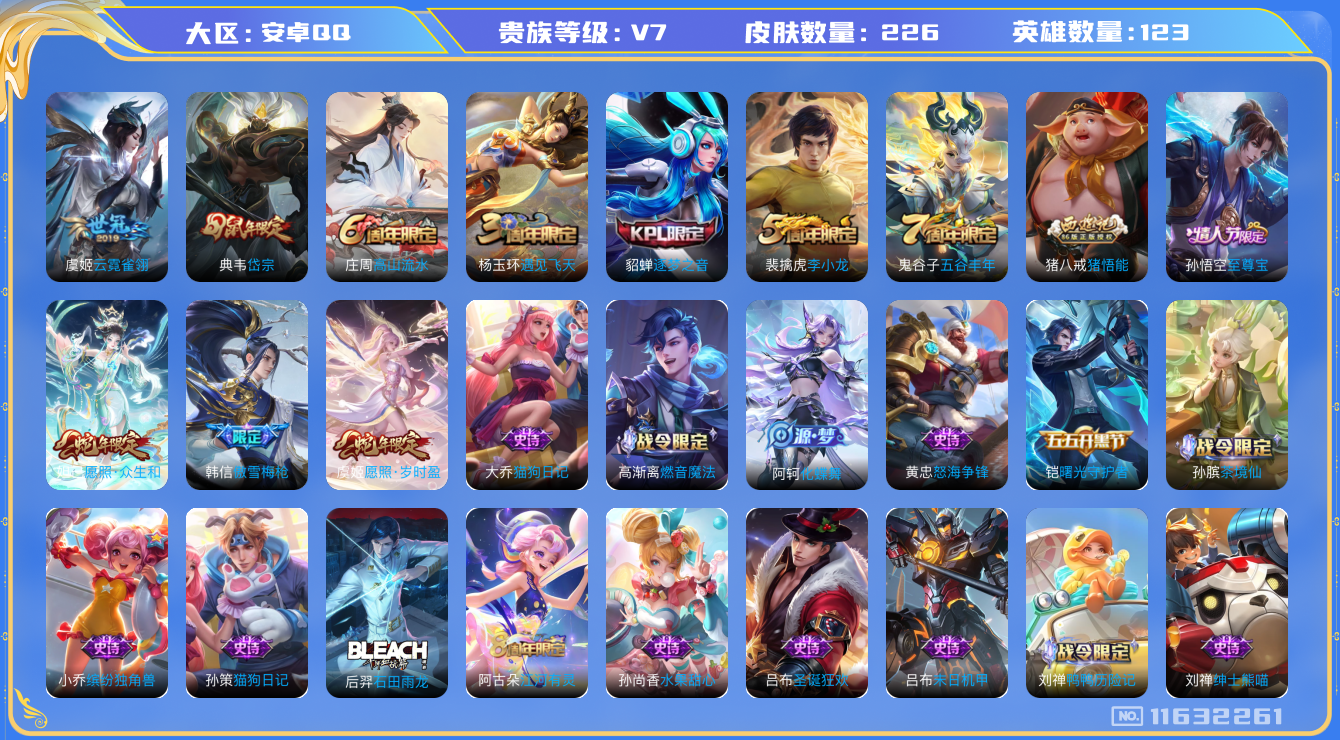 [11632261]V7 3传说 123英雄 226皮肤 可修改实名 优质装备:云霓雀翎 珍宝阁皮:优雅恋人,蔷薇恋人 限定皮:愿照·岁时盈(虞姬年限),愿照·众生和(妲己年限),至尊宝,傲雪梅枪,遇见飞天,高山流水,五谷丰年,岱宗(典韦年限),逐梦之音,李小龙,猪悟能 史诗皮:鸭鸭历险记-刘禅,化蝶舞,龙之律动,石田雨龙,茶境仙,怒海争锋,遇见神鹿,白龙吟,特工魅影,江河有灵,高渐离燃音魔法,偶像歌手,龙骑士(小龙虾),末日机甲-吕布,猫狗日记-孙策,猫狗日记-大乔,女仆咖啡,水果甜心,绅士熊喵,心灵骇客,功夫厨神,鬼剑武藏,纤云弄巧,繁星吟游(呼啦呼啦),拒霜思,缤纷独角兽,逐浪之夏,曙光守护者,唤灵魅影,原初追逐者,圣诞狂欢,圣诞恋歌,鹰眼统帅,魅力维加斯,黎明之约,未来纪元-赵云