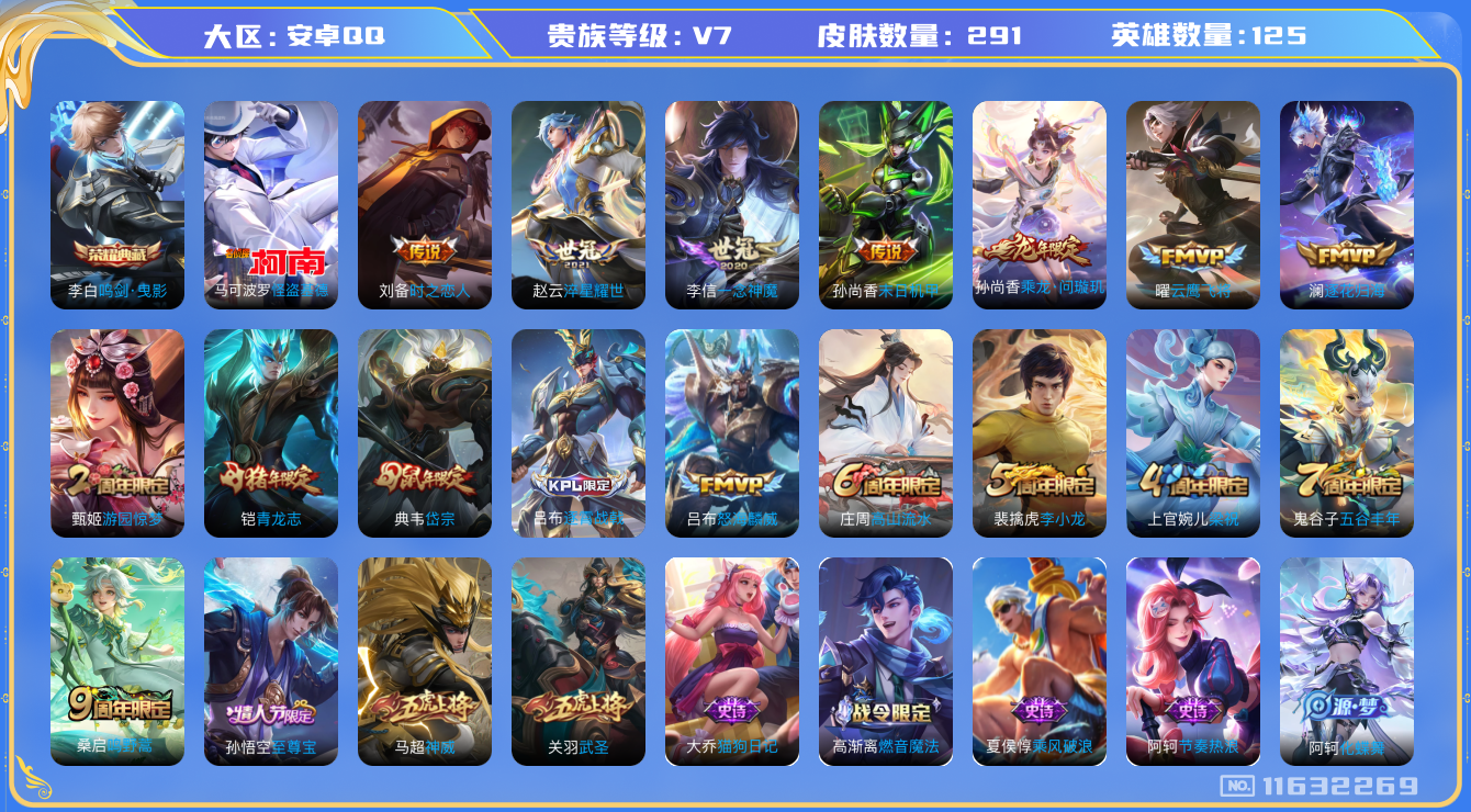 [11632269]V7 1典藏 1珍品传说 10传说 125英雄 291皮肤 可修改实名 优质装备:鸣剑·曳影,怪盗基德,云鹰飞将(小将军),一念神魔,末日机甲-孙尚香(绿蚂蚱),时之恋人-刘备(电焊工),淬星耀世,澜逐花归海 传说皮:乘龙·问璇玑(孙尚香年限) 珍宝阁皮:玩趣恶龙 限定皮:逐霄战戟,鸣野蒿,至尊宝,神威(电光马子),高山流水,怒海麟威,五谷丰年,青龙志(铠年限),武圣,游园惊梦,梁祝,岱宗(典韦年限),李小龙 史诗皮:赞萌露比,鸭鸭历险记-刘禅,化蝶舞,星界战将,龙之律动,茶境仙,破空之剑,蒙犽顽岩魄,埋骨钱,琥珀纪元伽罗,上官婉儿群星魔术团,蔬乡物语(鲁班七号),百相守梦-百里守约,紫霞仙子,白龙吟,黄金分割率,特工魅影,千年之狐,永昼,江河有灵,百解令(蒙犽),高渐离燃音魔法,冰冠公主,偶像歌手,晚萤,末日机甲-吕布,猫狗日记-孙策,猫狗日记-大乔,乱世虎臣,节奏热浪,修罗,女仆咖啡,摇滚巨星,水果甜心,绅士熊喵,星夜王子,心灵骇客,时之奇旅-安琪拉,功夫厨神,暗隐猎兽者,幽灵船长,鬼剑武藏,心灵战警,天秀·启明,舞动绿茵,地狱岩魂,纤云弄巧,繁星吟游(呼啦呼啦),缤纷独角兽,乘风破浪,逐浪之夏,水晶猎龙者,曙光守护者,箭羽风息,金属风暴,原初追逐者,圣诞狂欢,圣诞恋歌,鹰眼统帅,黎明之约,无心,未来纪元-赵云